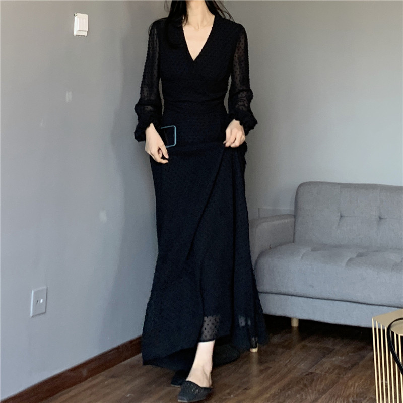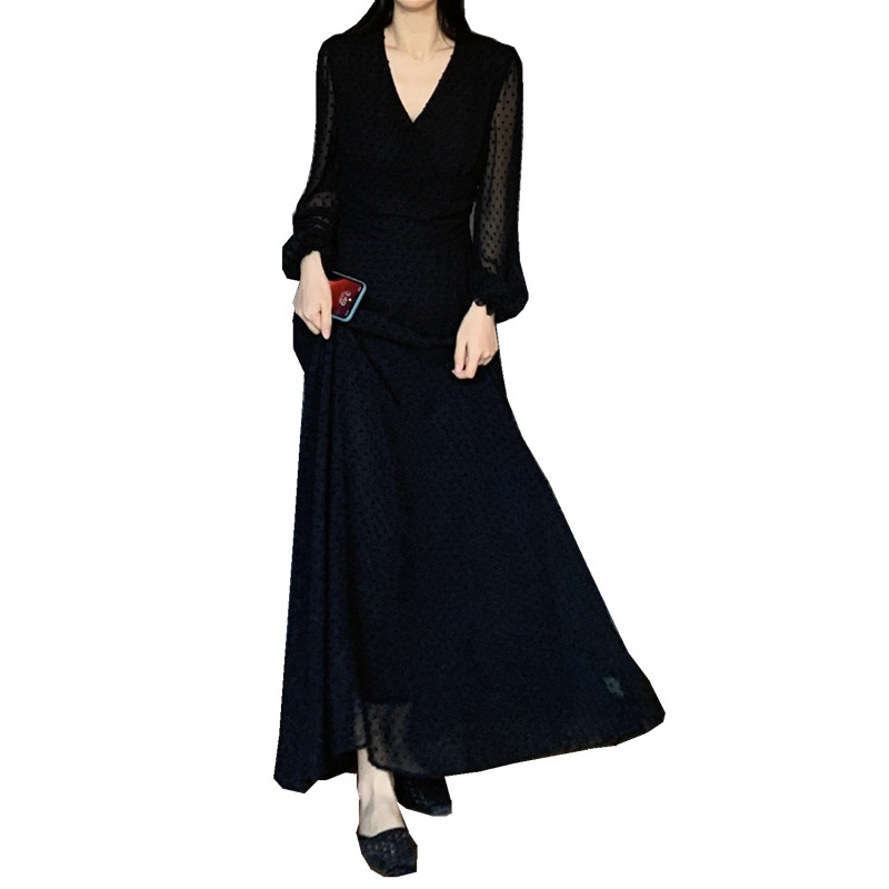 到脚踝的超长款连衣裙 秋冬内搭V领打底裙 长袖波点收腰拖地长裙