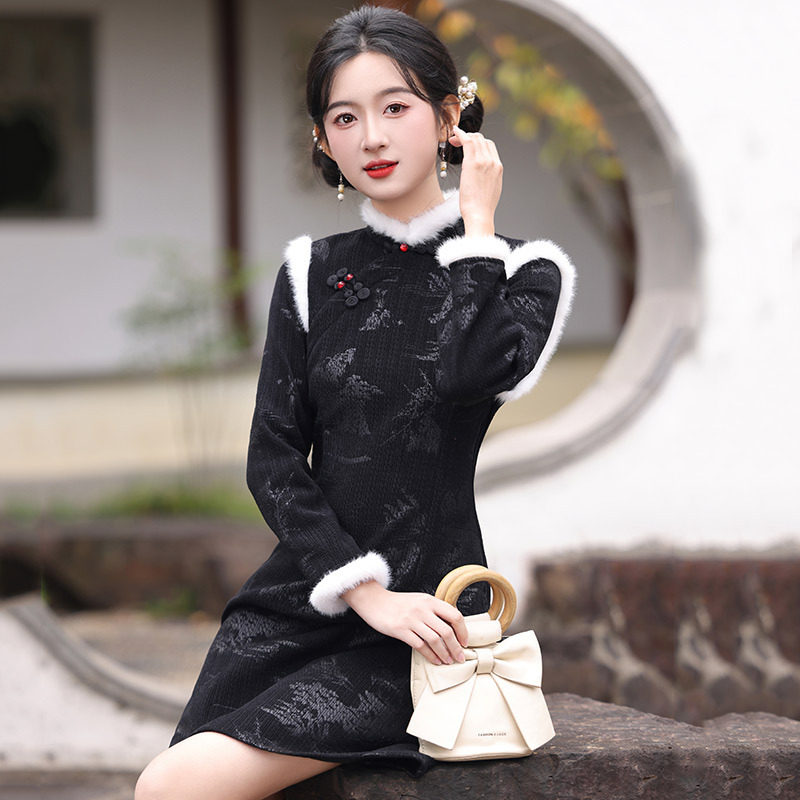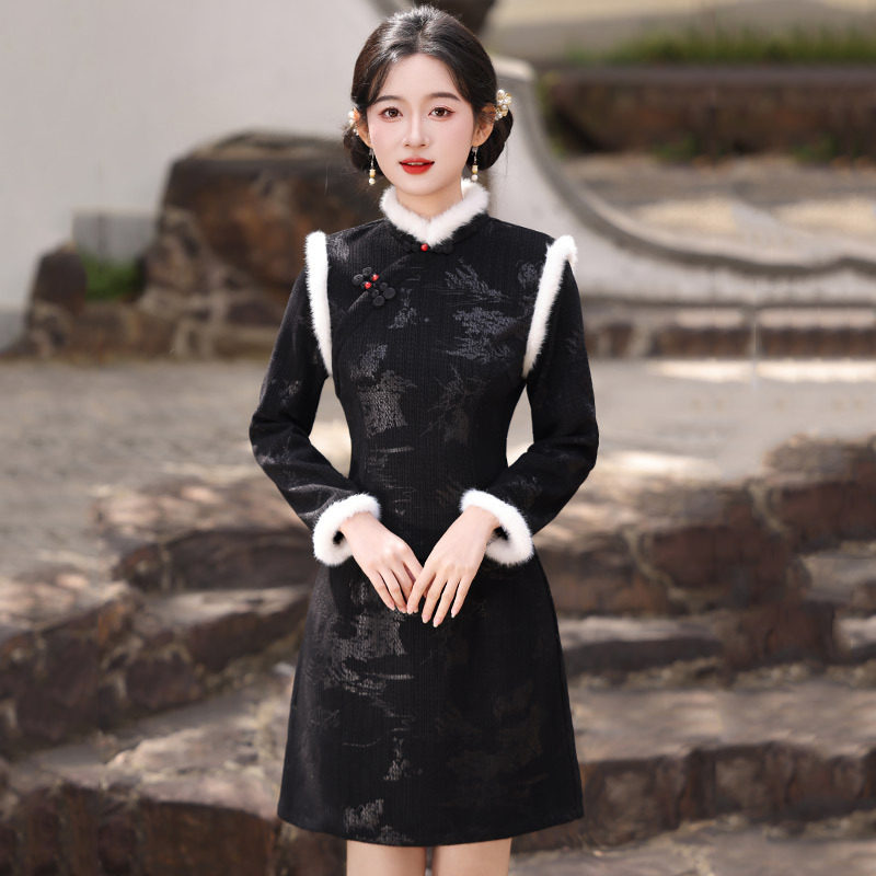 冬款加绒加厚黑色短款长袖旗袍2025新款年轻款女小个子连衣裙冬季