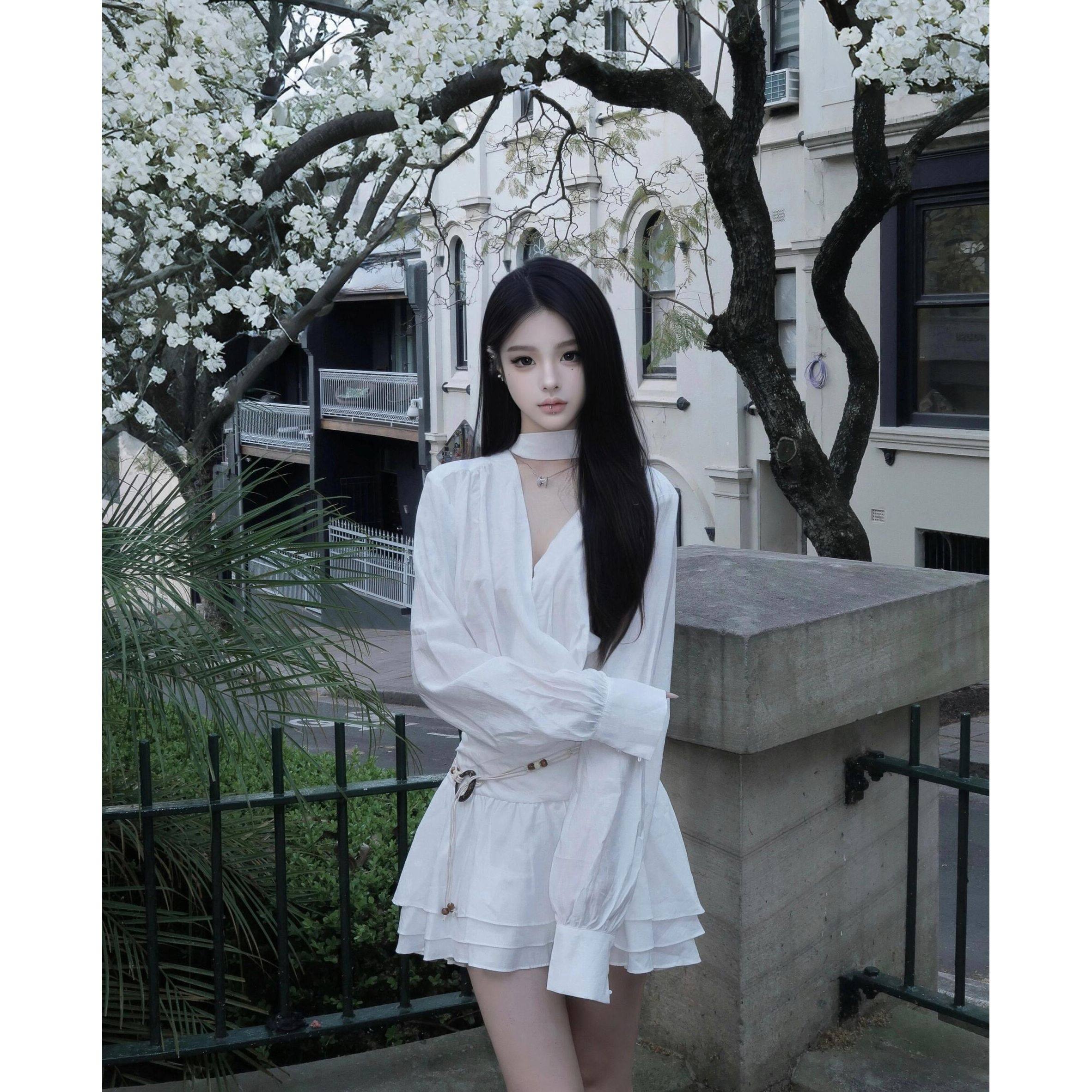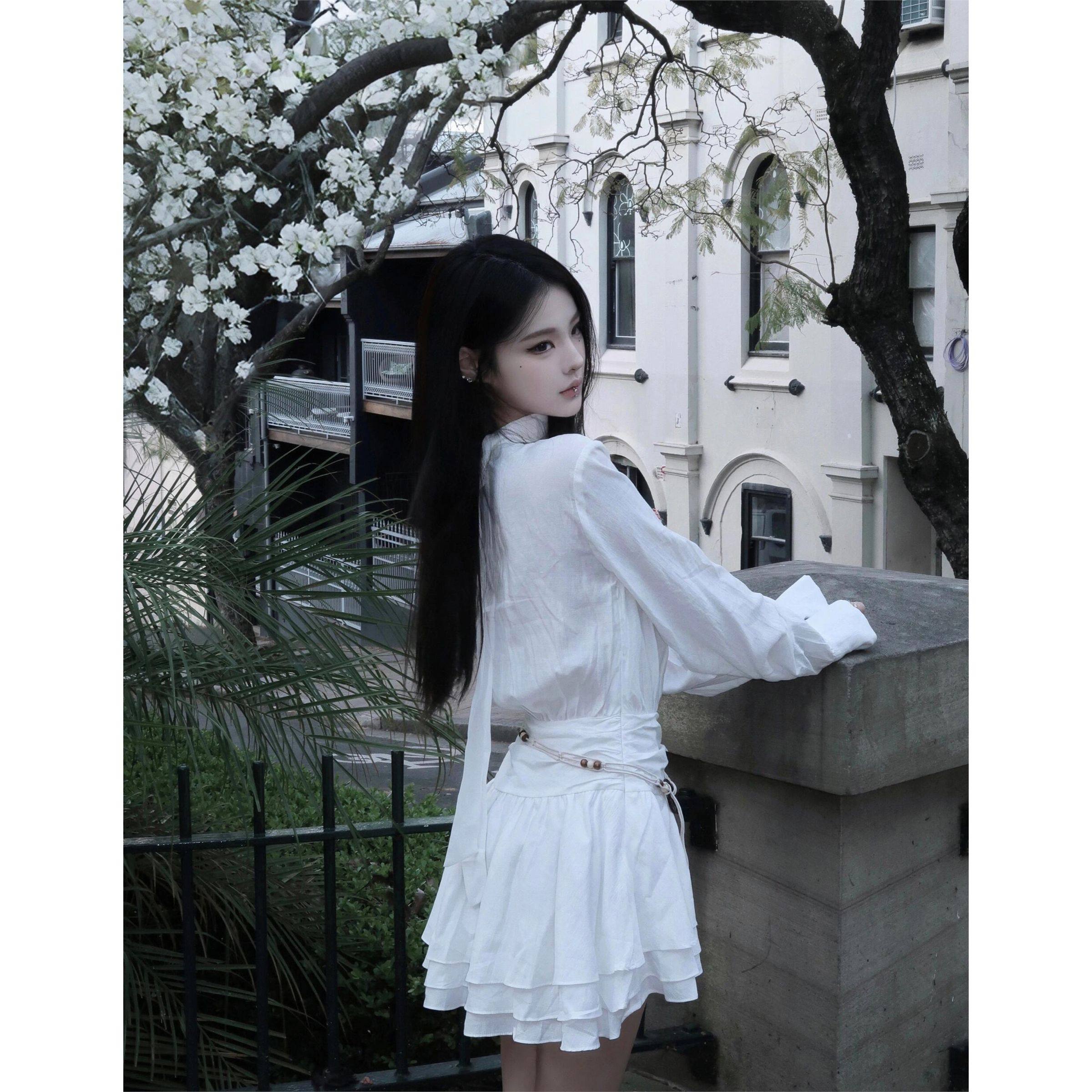 2024秋新款白色长袖v领衬衫连衣裙女法式高级设计感收腰褶皱短裙