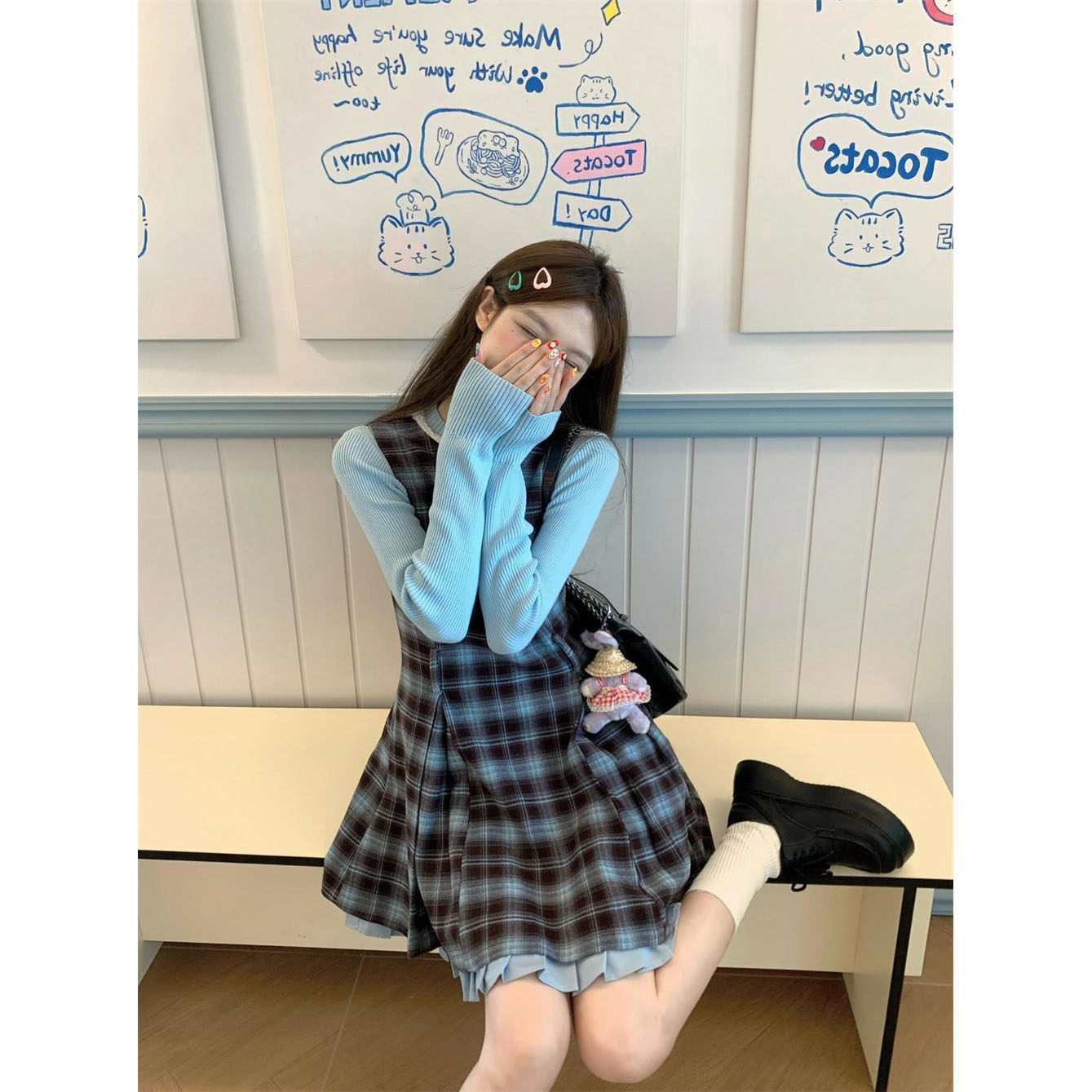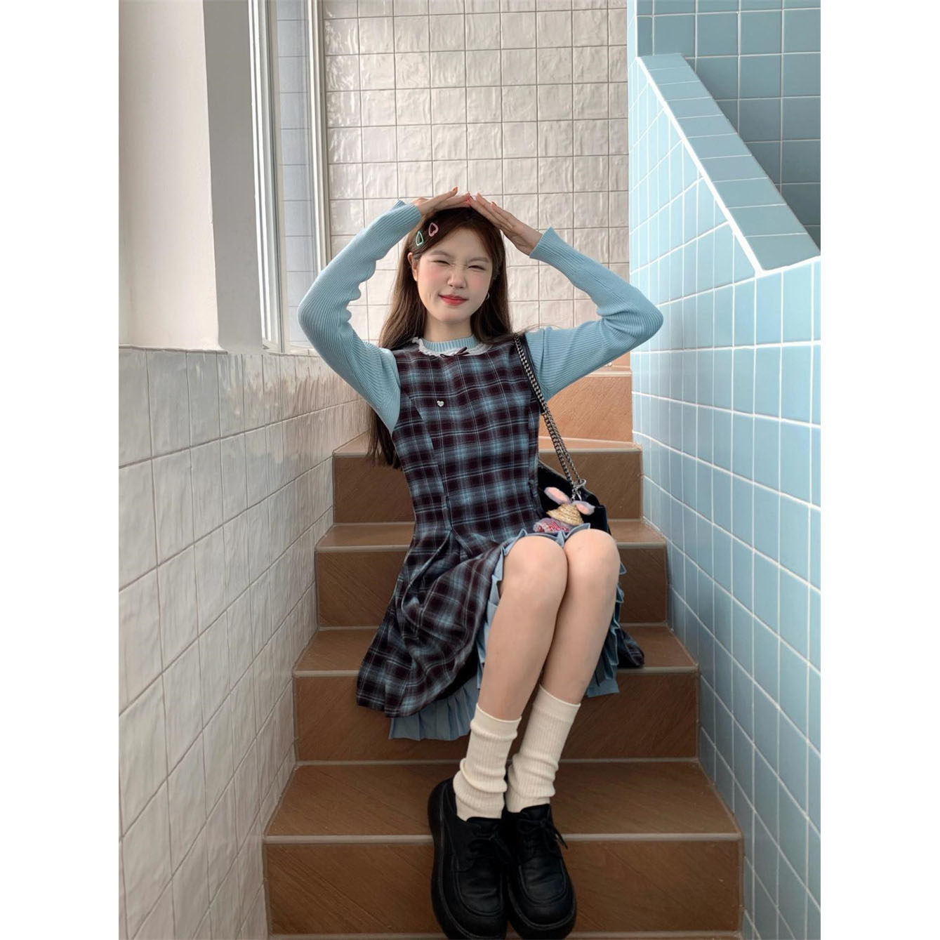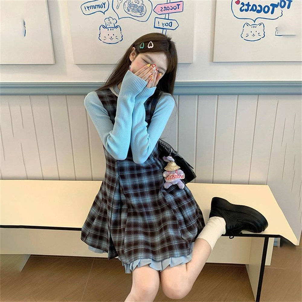 秋季新款小个子复古格纹背心连衣裙+针织长袖上衣学生女时尚套装