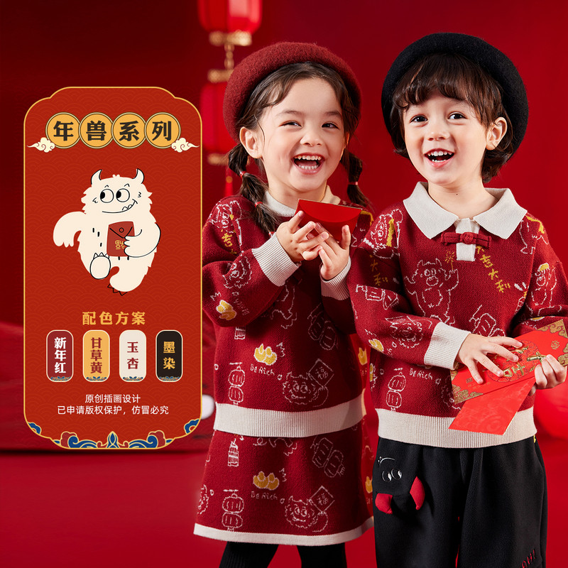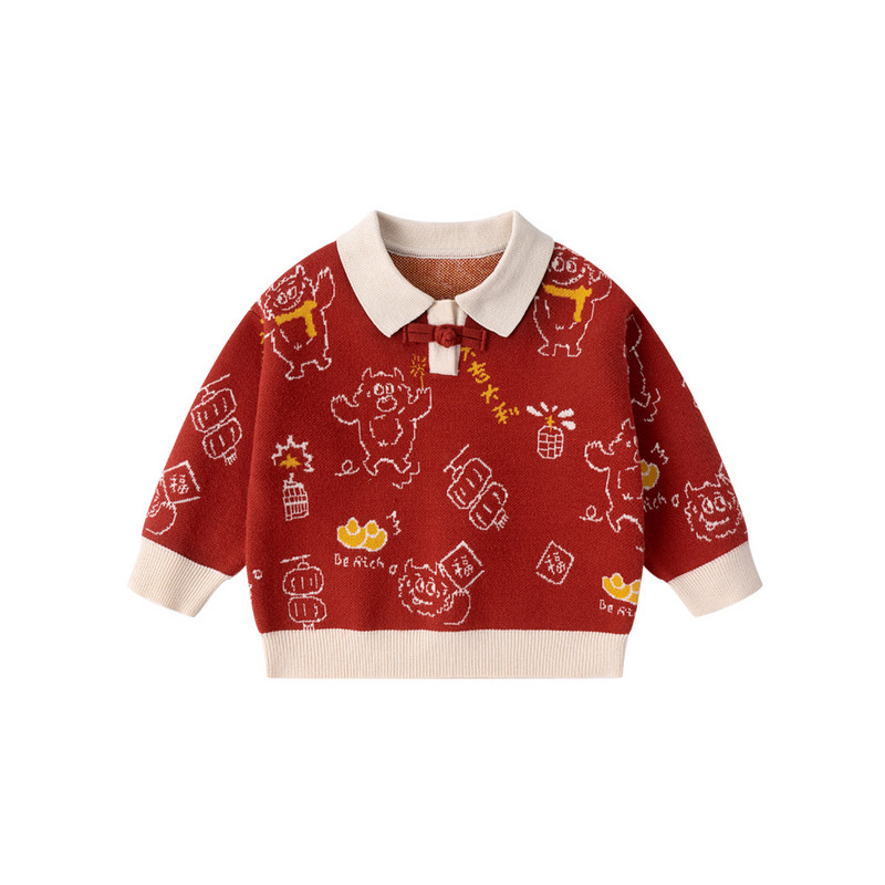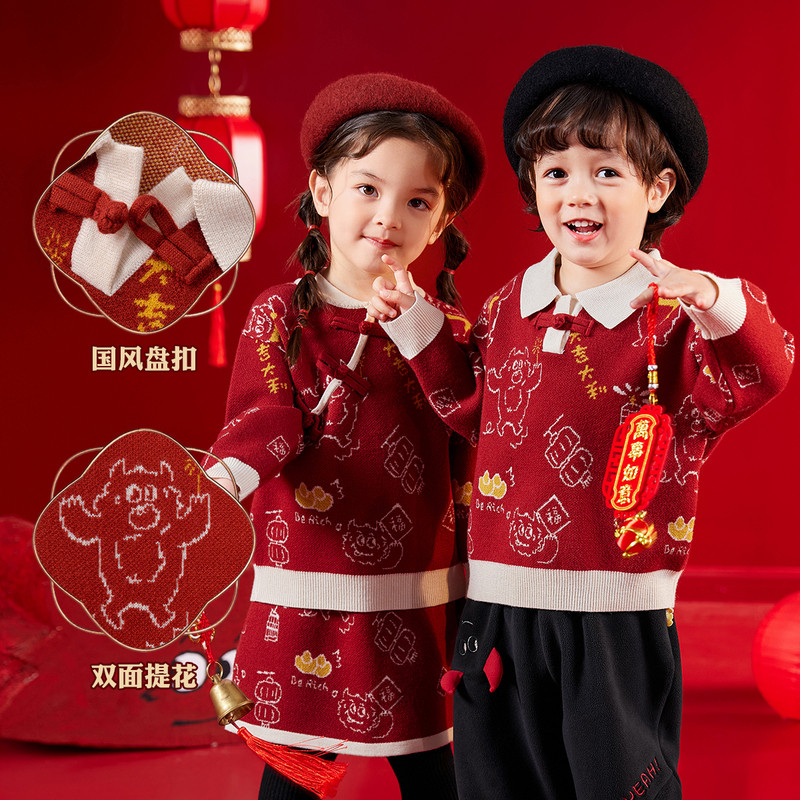 嘟嘟家儿童唐装毛衣红色过年国风宝宝周岁礼服新中式男童年服冬装