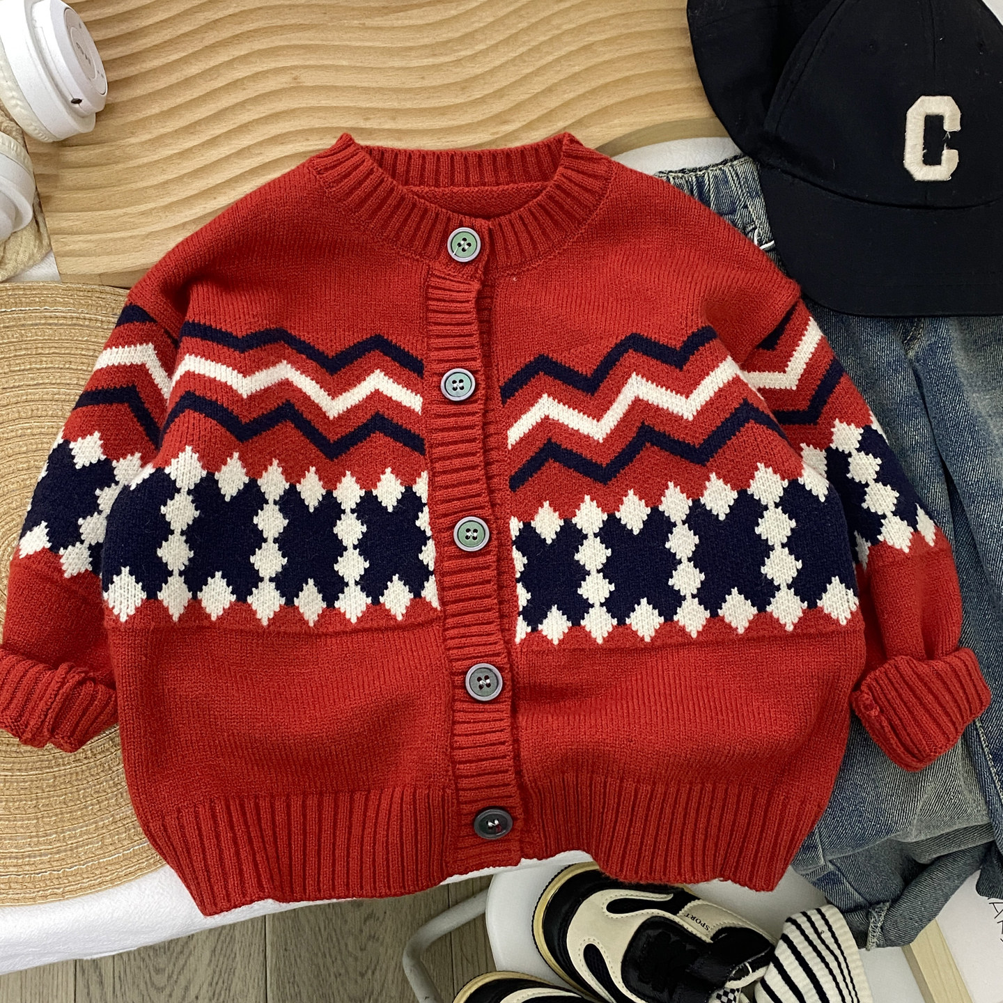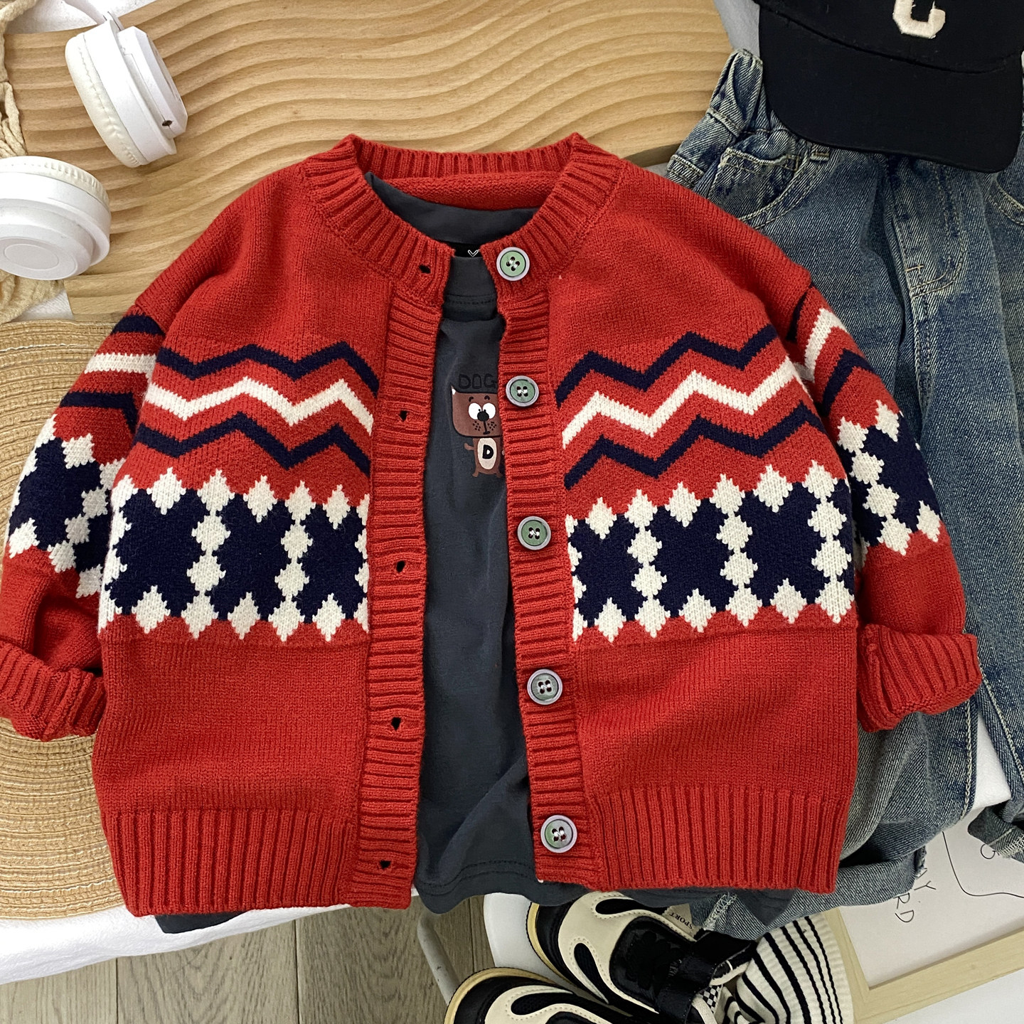 男童毛衣外套圆领秋冬2026新款儿童针织开衫红色韩版中童小童洋气