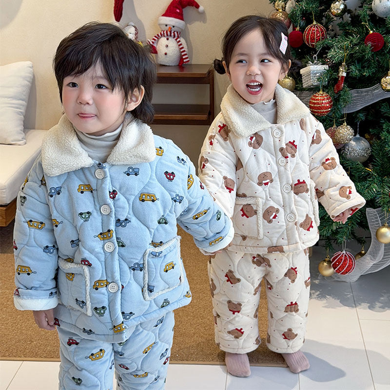 儿童夹棉睡衣冬季女童三层加厚家居服套装秋冬款男童保暖加绒睡衣
