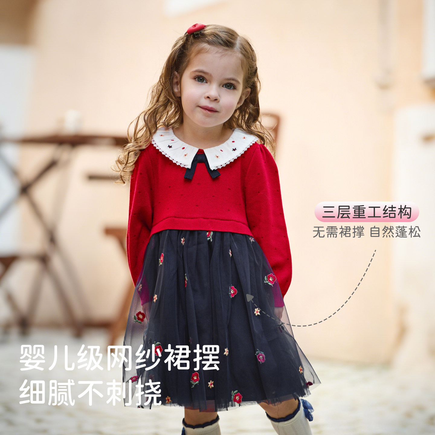 戴维贝拉儿童A类抗静电毛衣连衣裙女童2026新款红色裙子新年春装