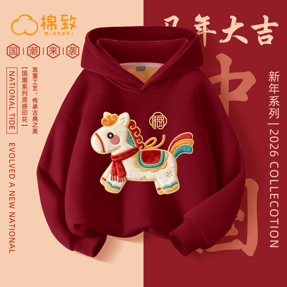 棉致男童卫衣儿童过年服2026马年本命年红色新年加绒男孩衣服女童