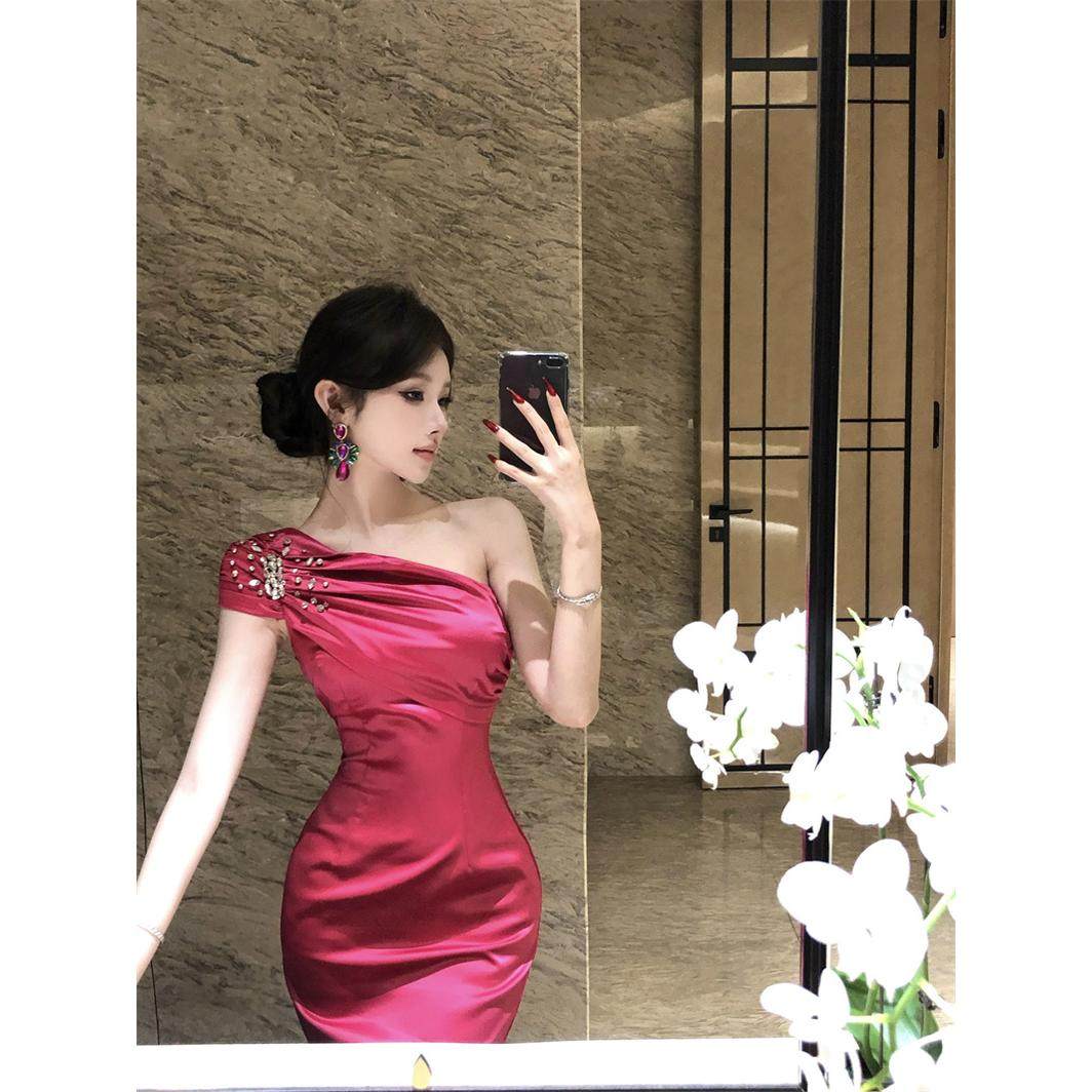 加小码小个子XXXS女装冬季150cm显高高级感时尚斜肩收腰连衣裙女