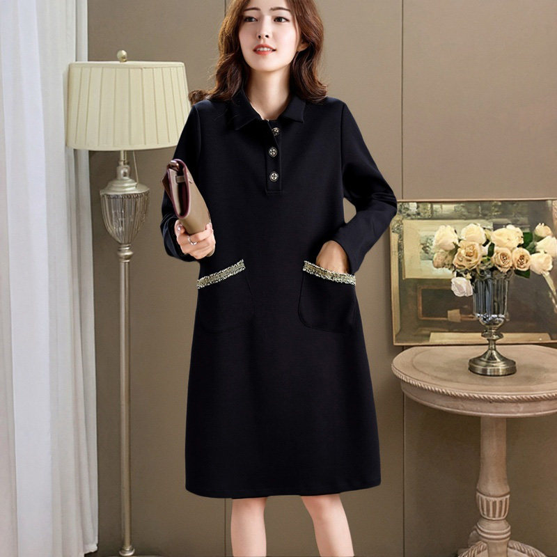 黑色翻领连衣裙女中长款大码显瘦时尚亮丝长袖高端太空棉面料女装