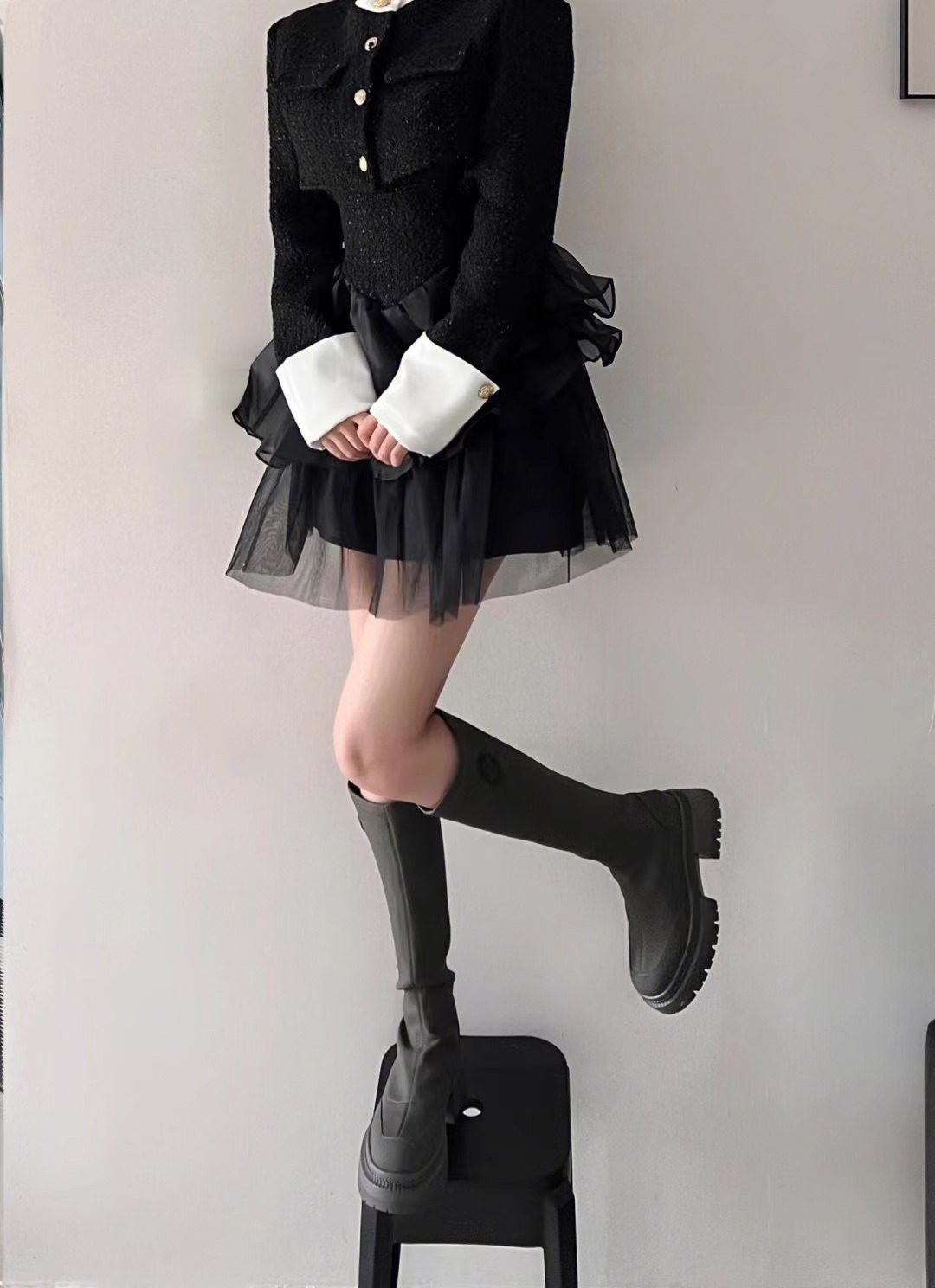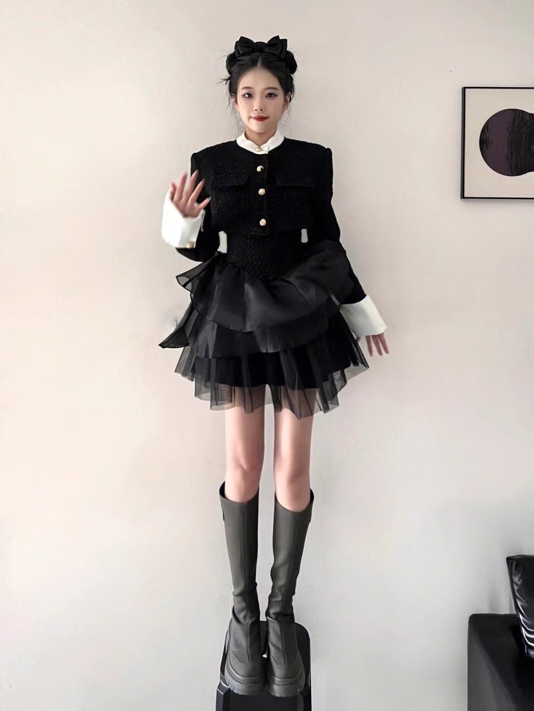春秋新款炸街小香风短外套蓬蓬连衣裙小个子甜辣韩剧两件套装洋气