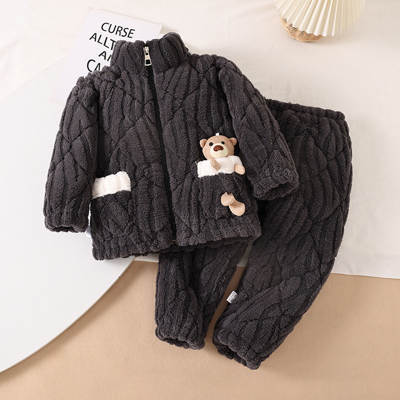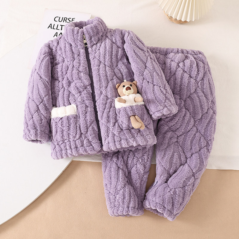 冬季三层夹棉加厚睡衣儿童女童珊瑚男孩男童法兰绒家居服宝宝套装