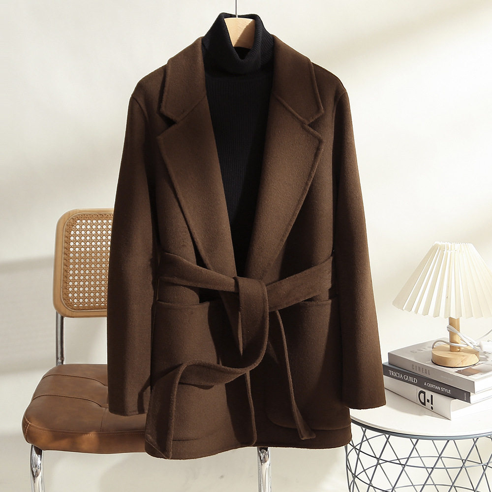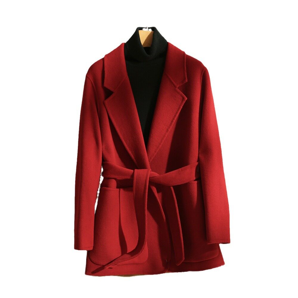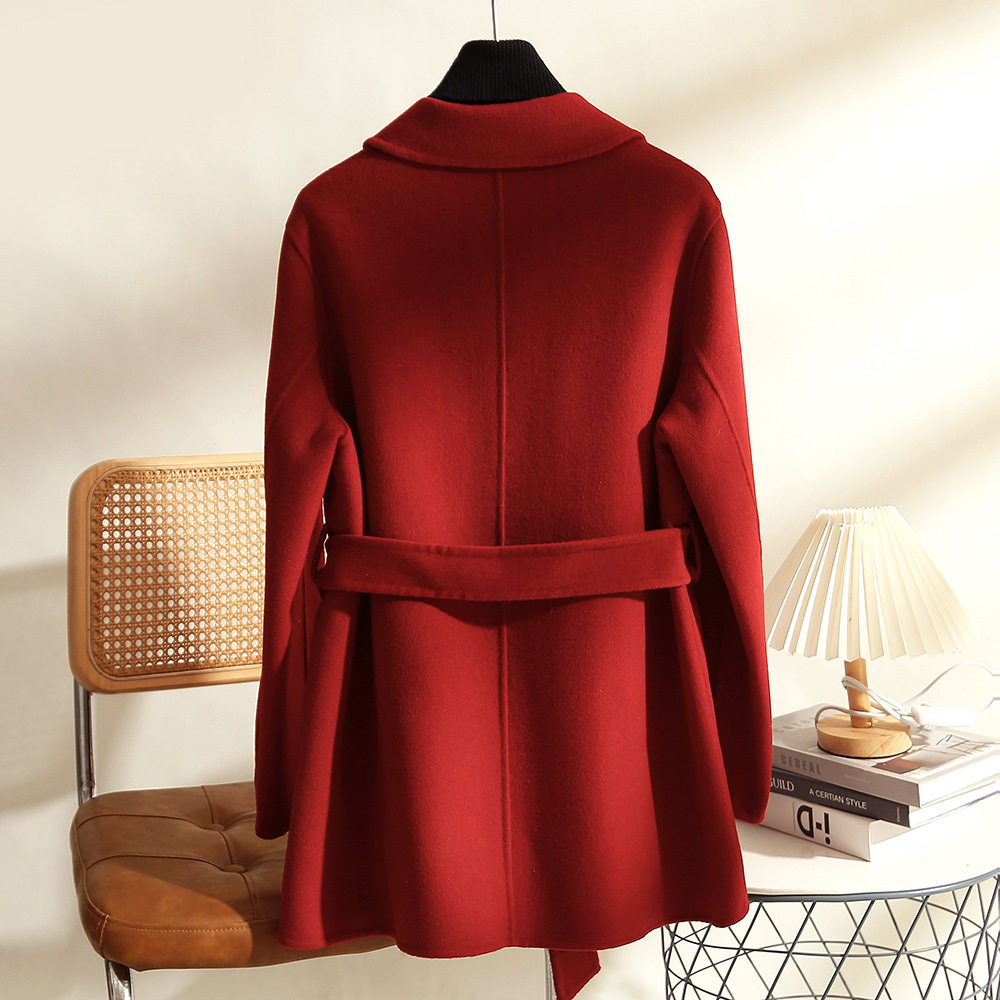 本命年红色双面羊毛大衣女中长款西装领收腰系带小个子毛呢外套冬