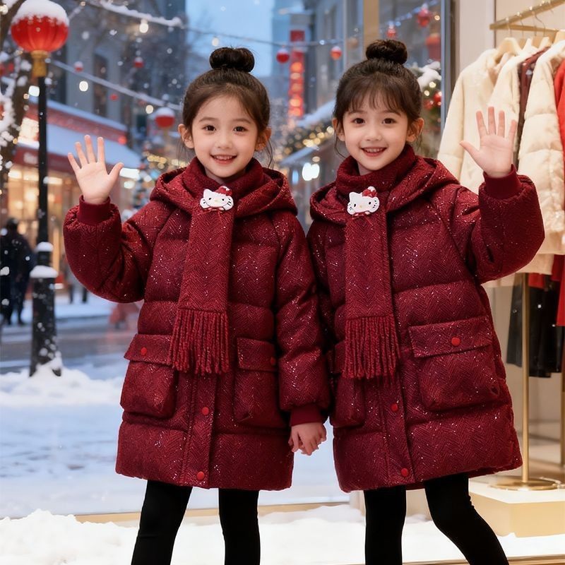 女童冬装羽绒棉服2026新款女孩新中式中长款棉袄红色新年加厚棉衣