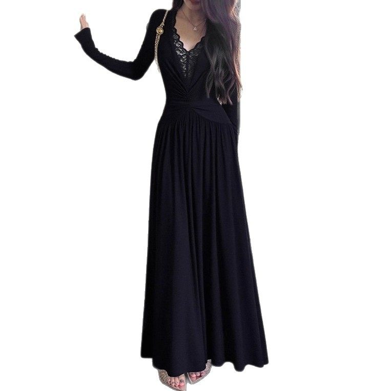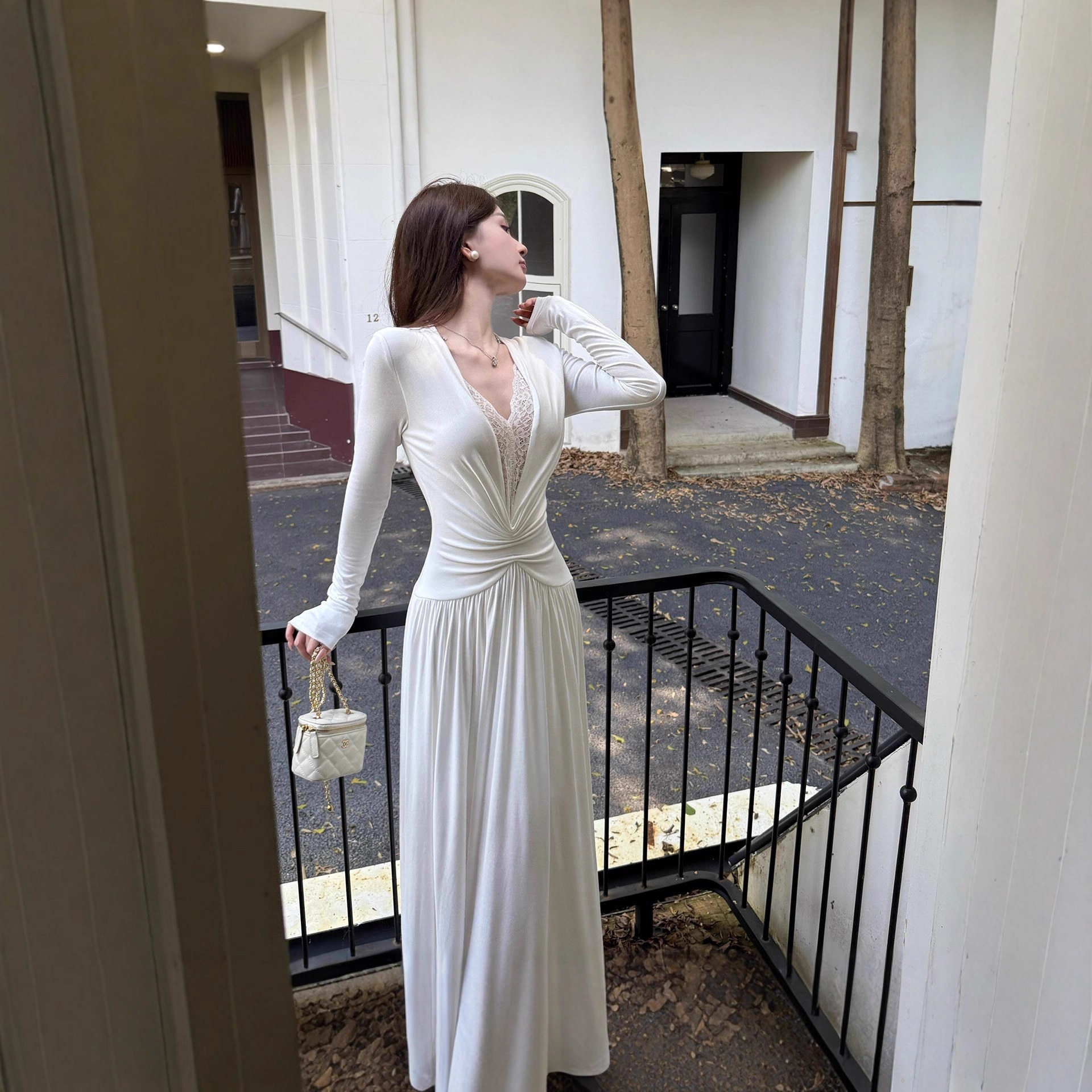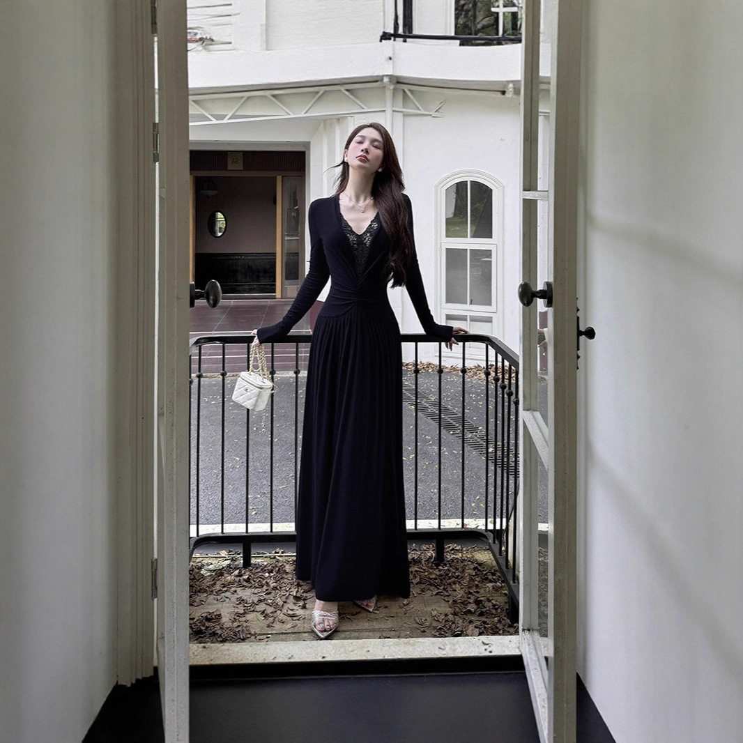 法式复古蕾丝拼接V领白色长袖连衣裙女2025早秋新款性感包臀裙子
