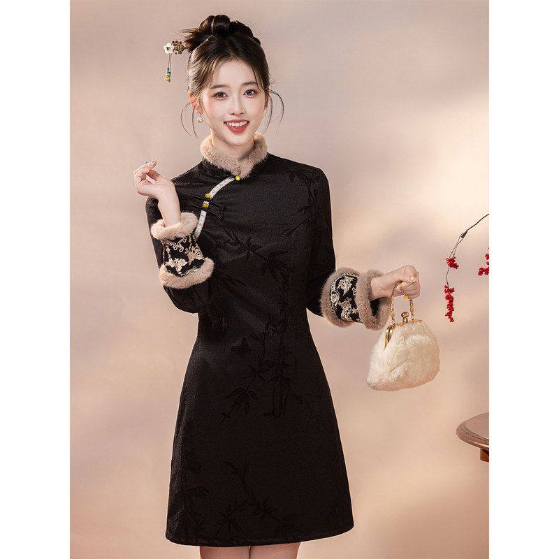 冬季旗袍女新中式加绒加厚2025新款小个子长袖黑色连衣裙改良绝美