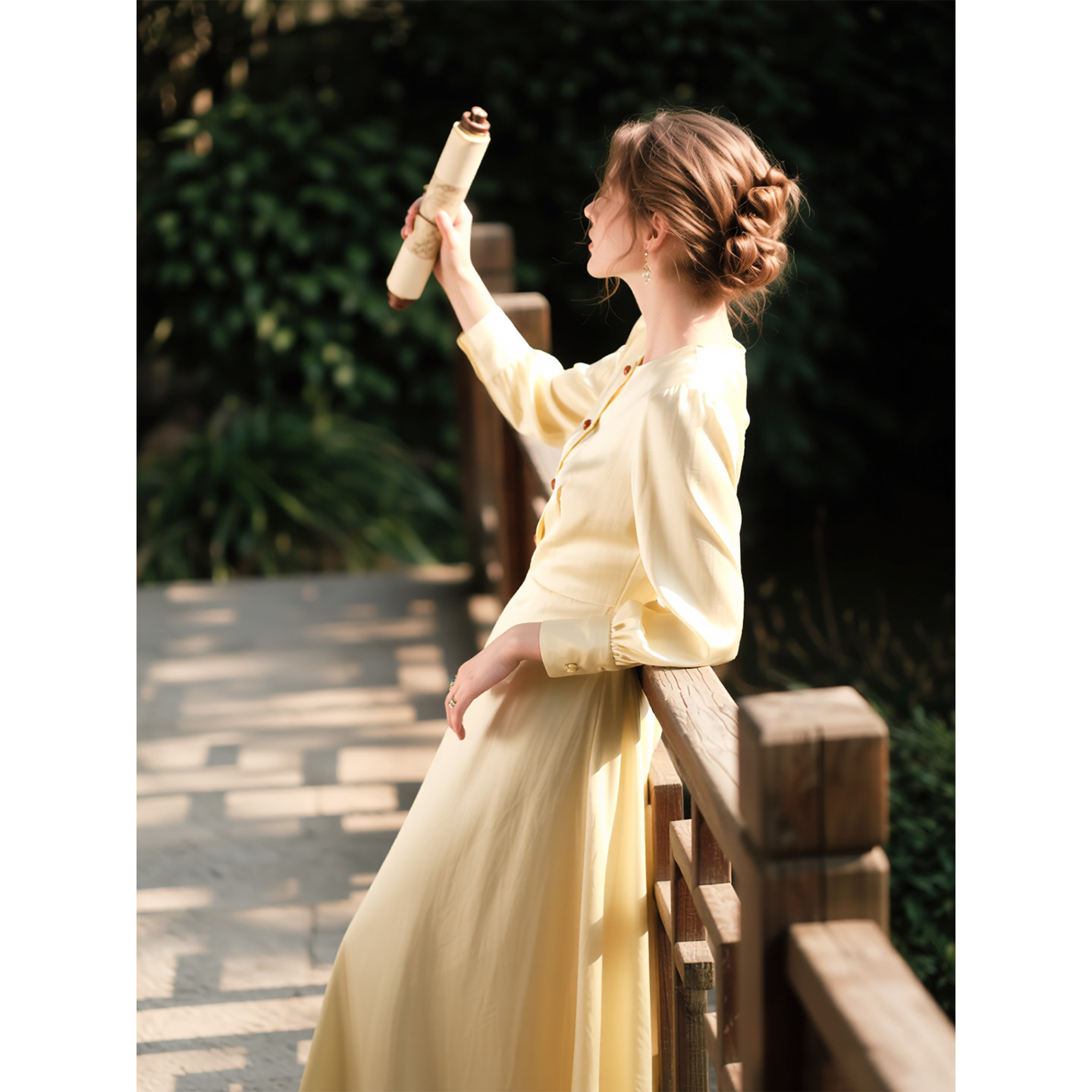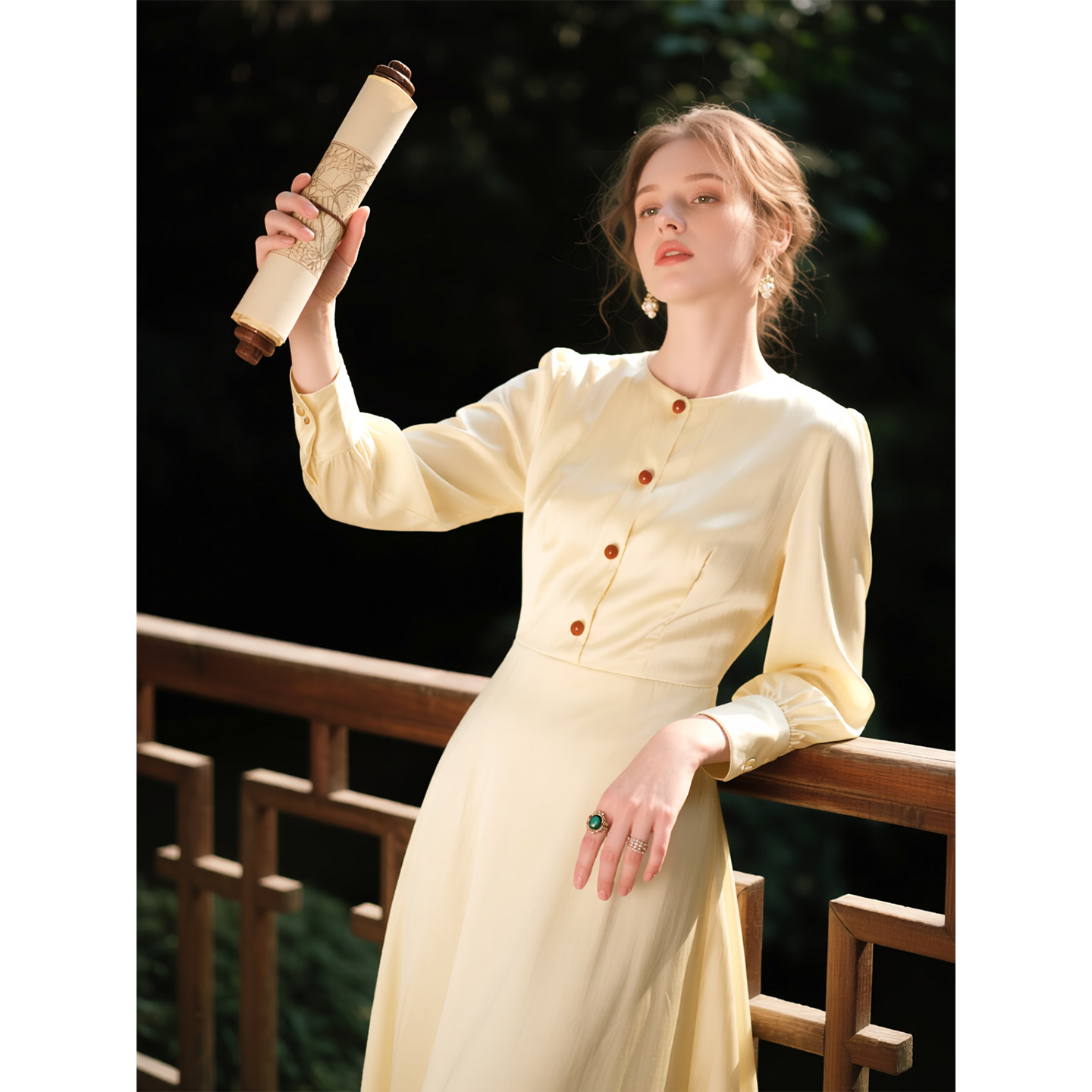 法式浅黄色缎面连衣裙女2026年春季新款轻奢高级感收腰显瘦长裙子