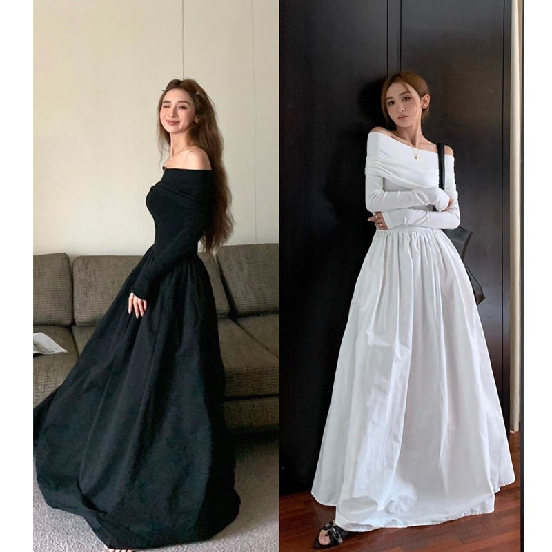 纯欲一字露肩长袖白色连衣裙女春秋季2025新款法式赫本风气质长裙