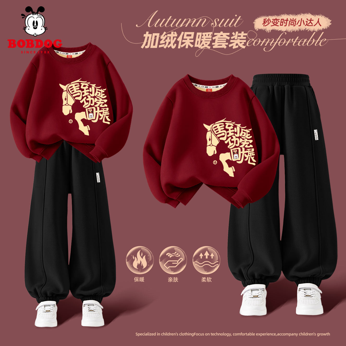 巴布豆马年本命年男童过年套装拜年服2026新款儿童红色加绒卫衣冬