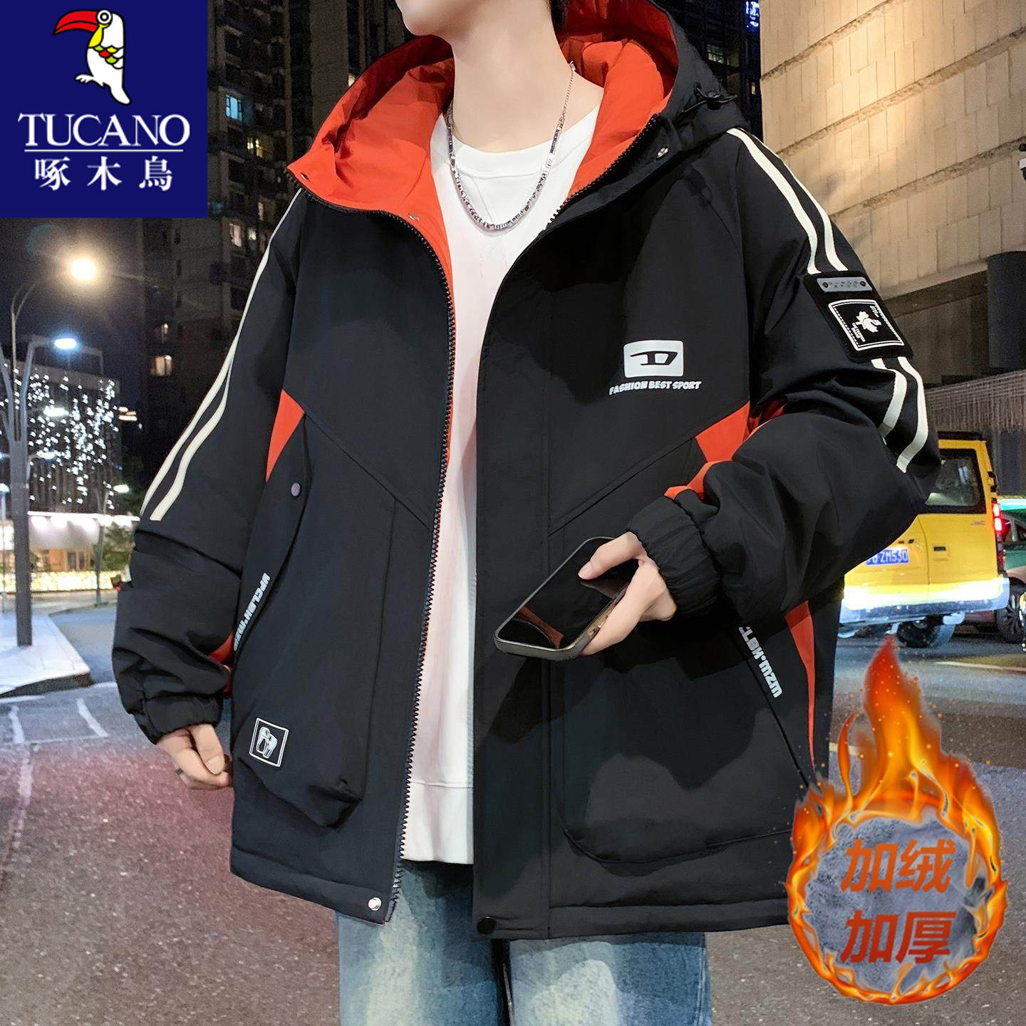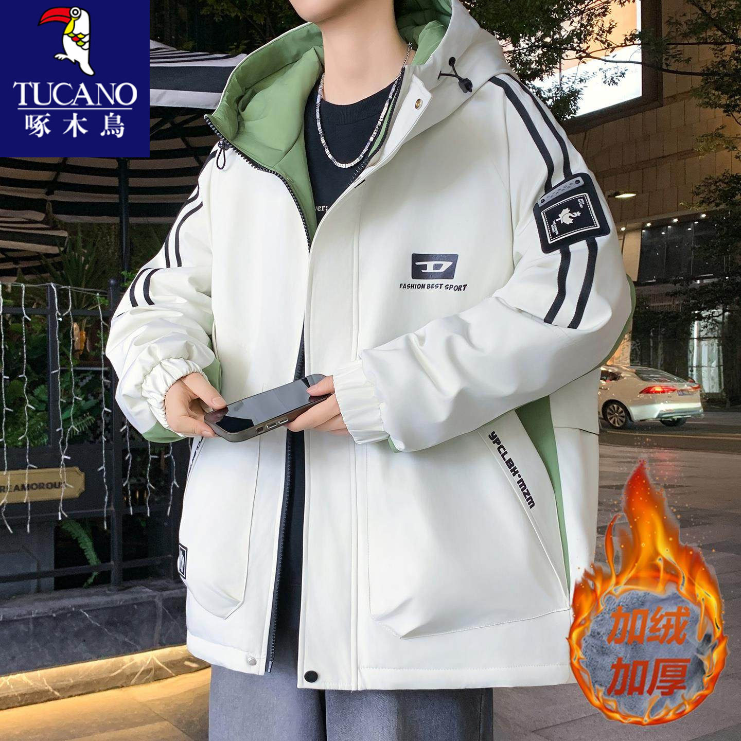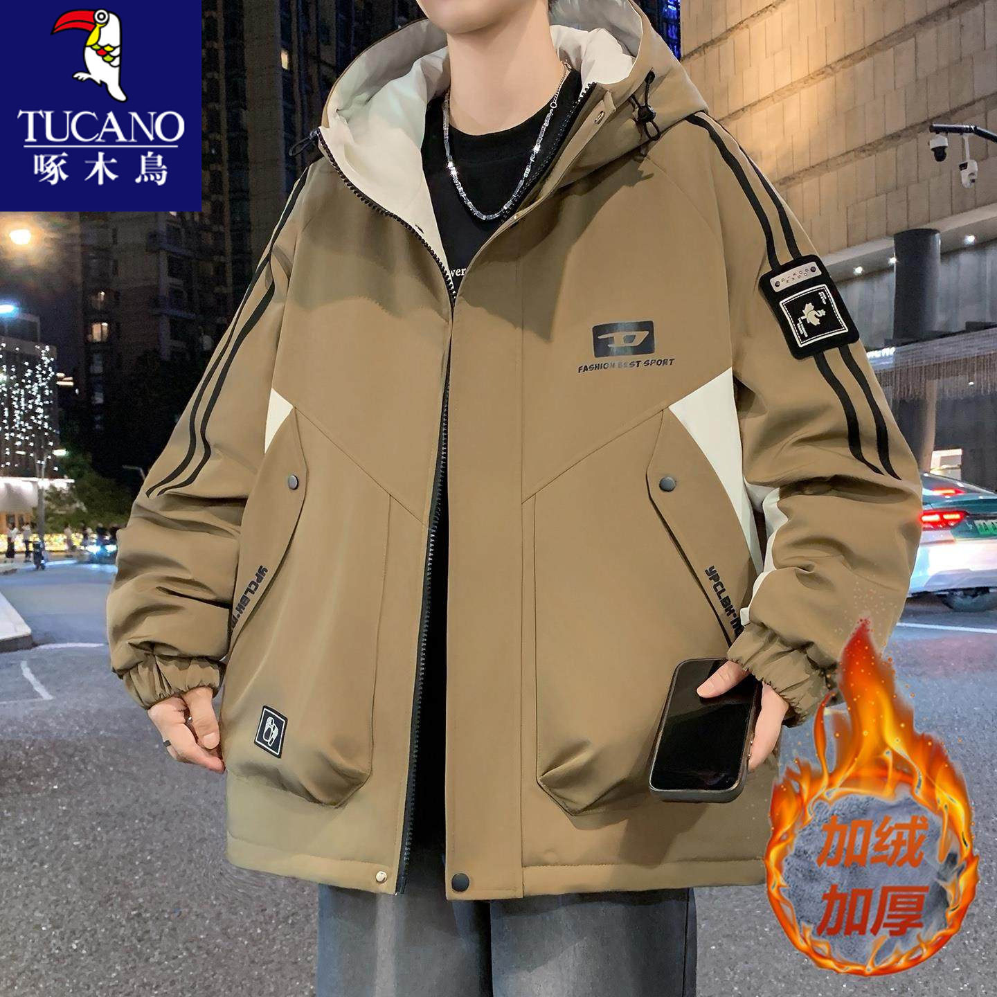 啄木鸟秋冬款加绒加厚冲锋衣外套男孩初中学生青少年大童冬装夹克