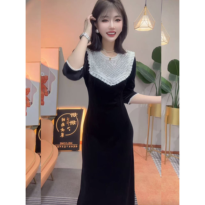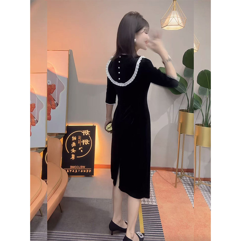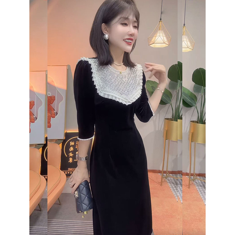 法式赫本风黑色金丝绒气质款长裙2025秋季新品高腰显瘦中袖连衣裙