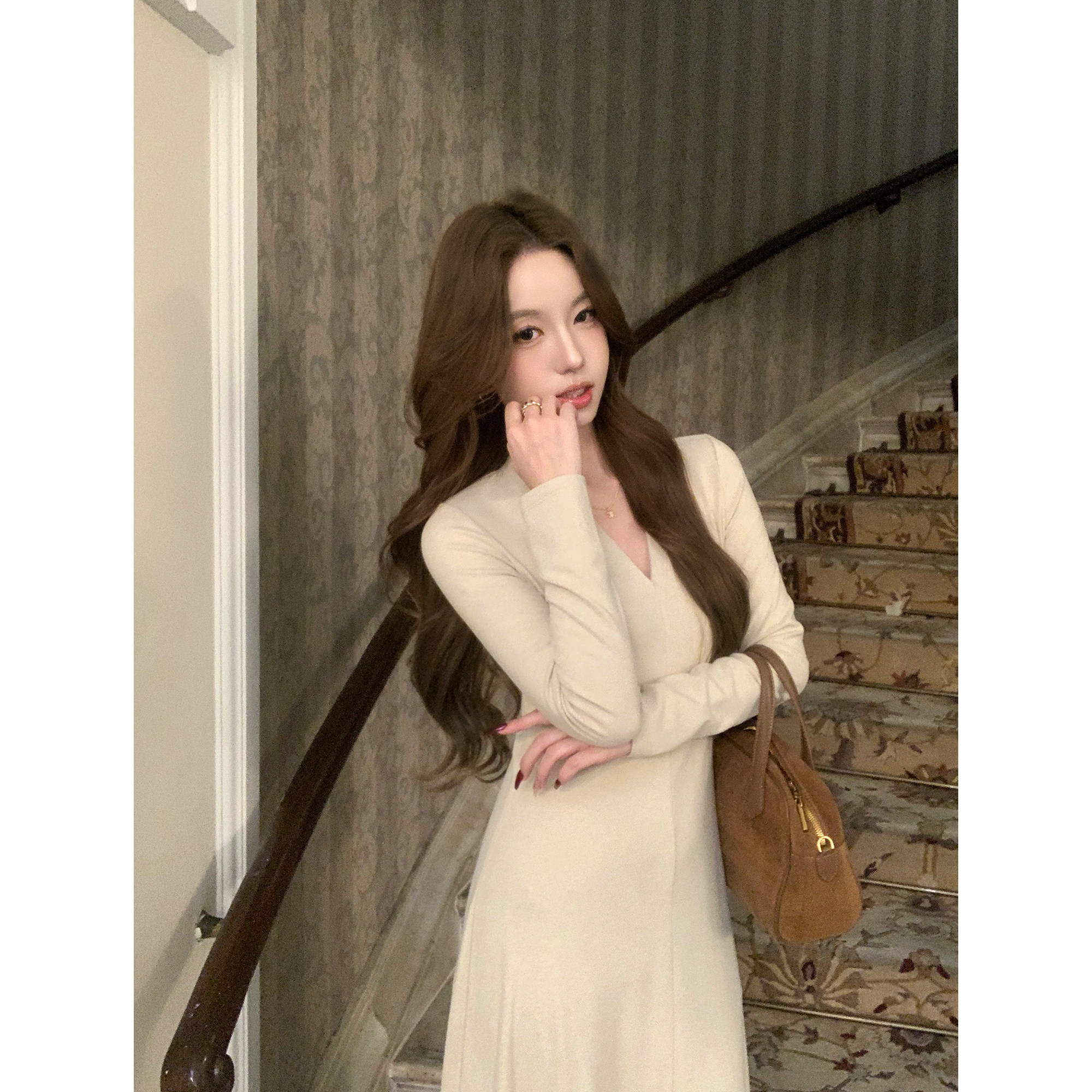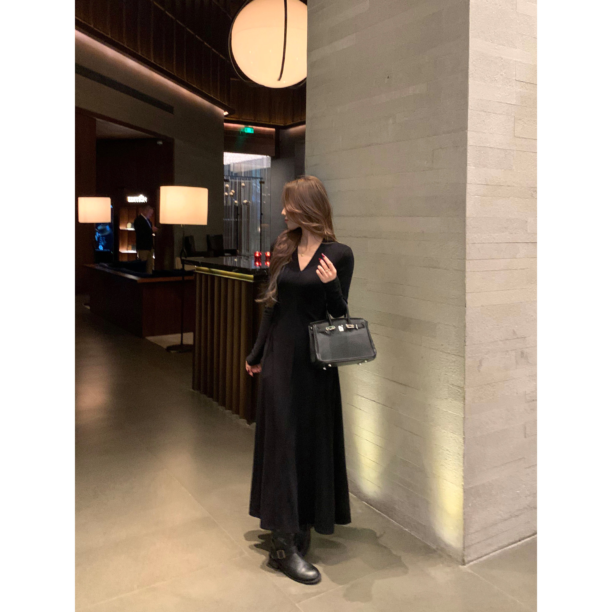 pusumede摩登律动 法式V领长袖连衣裙女简约修身垂感打底针织长裙