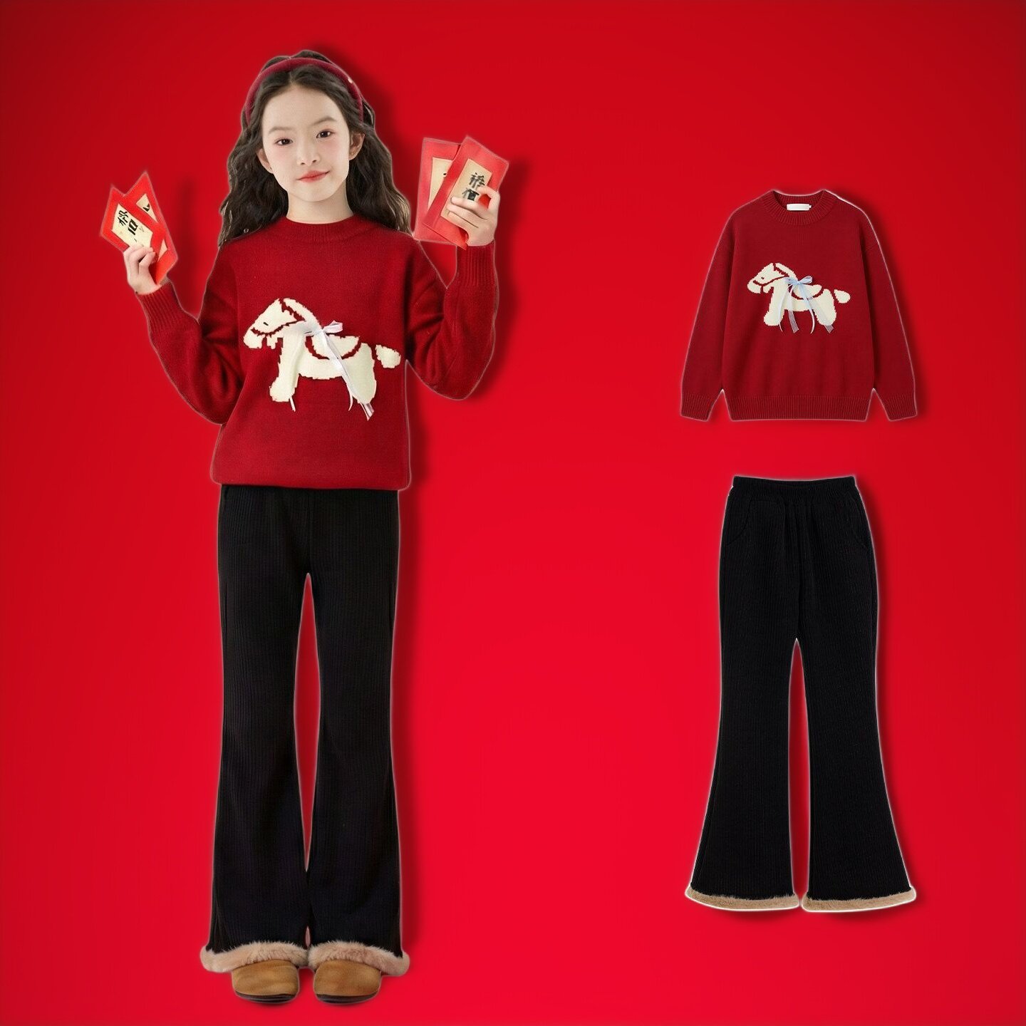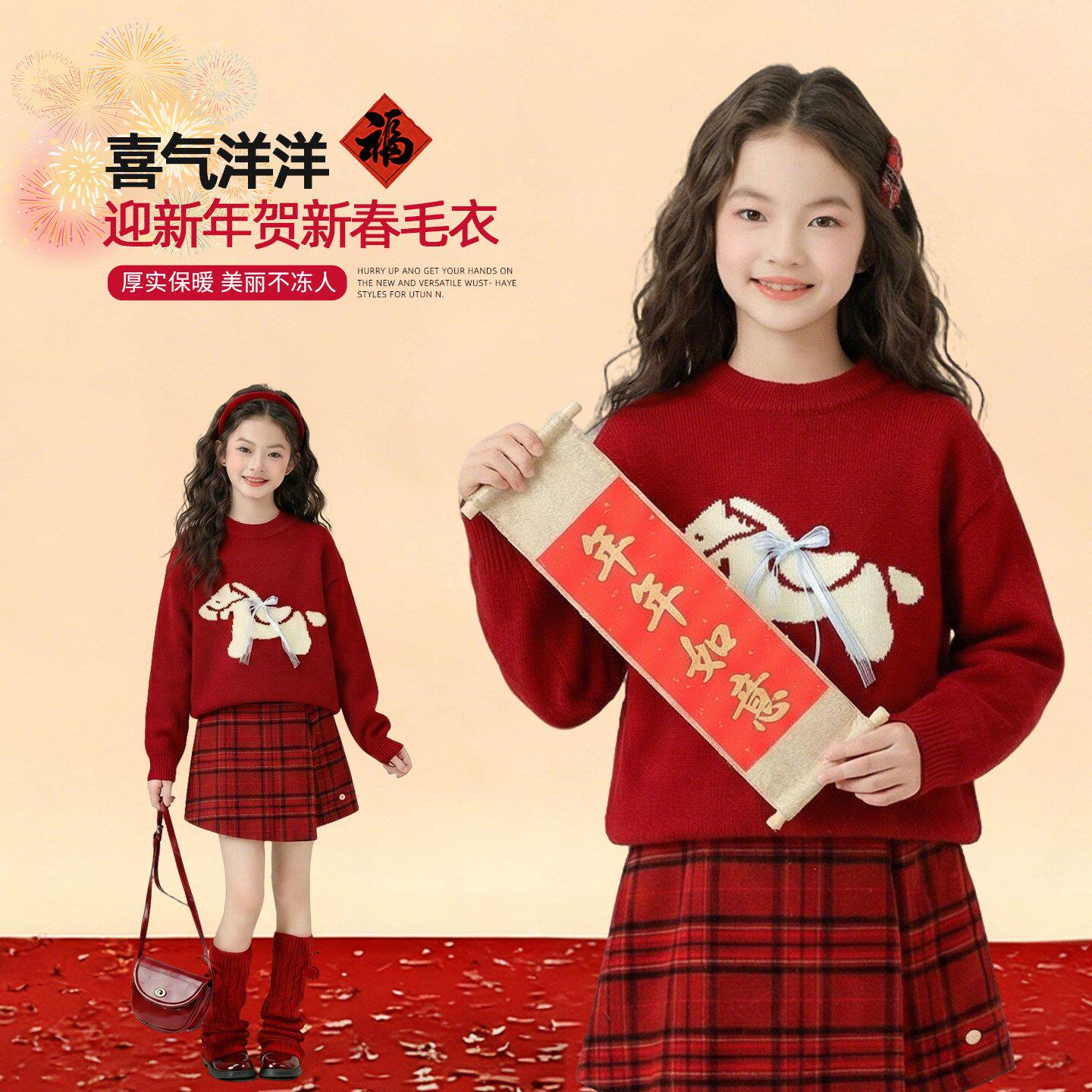 女童红色加厚套装儿童2026冬季新年12岁女孩过年毛衣拜年衣服大童