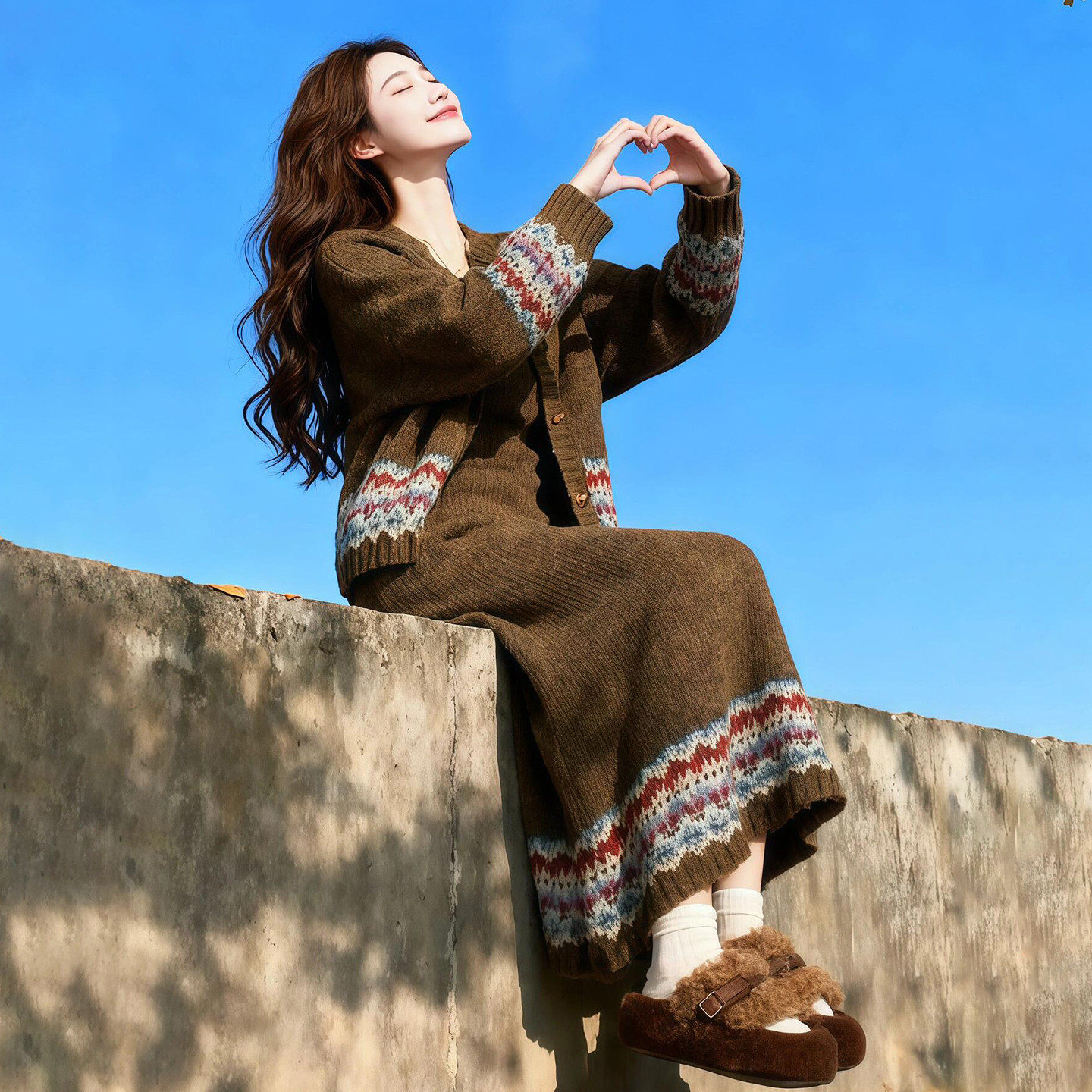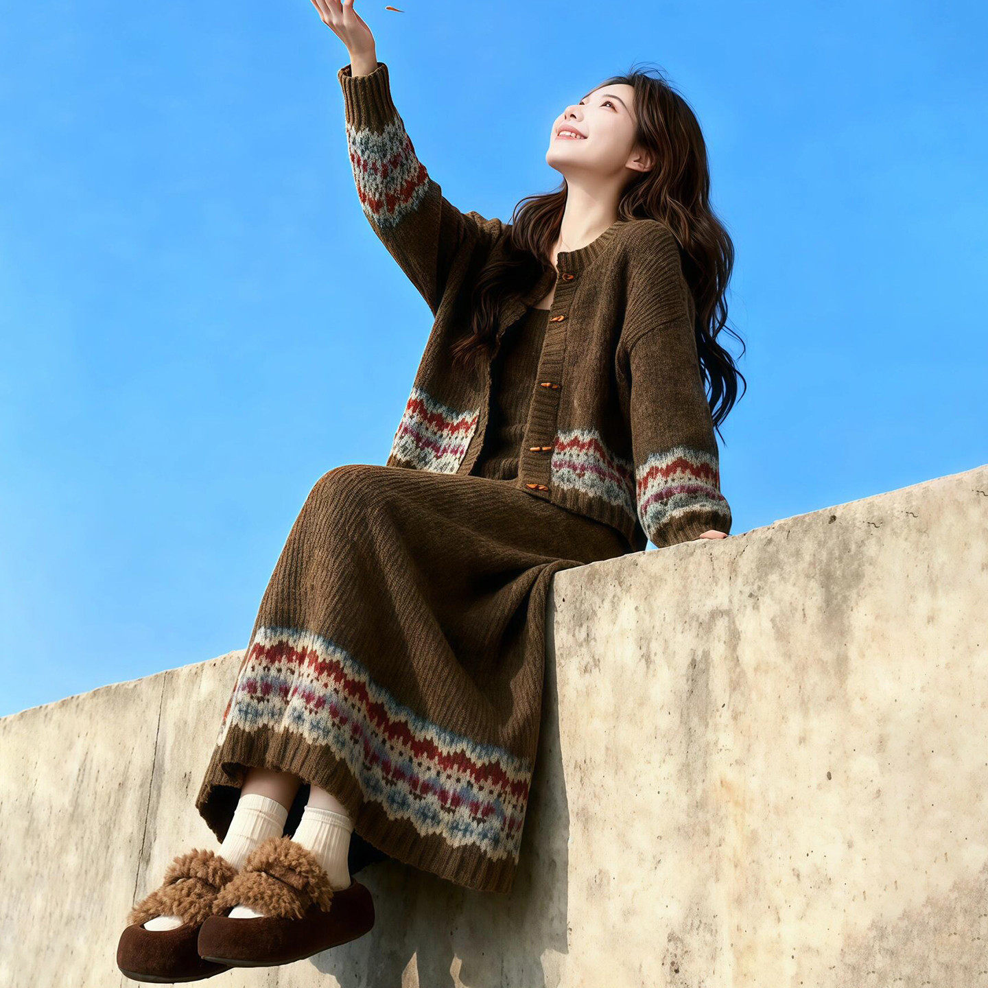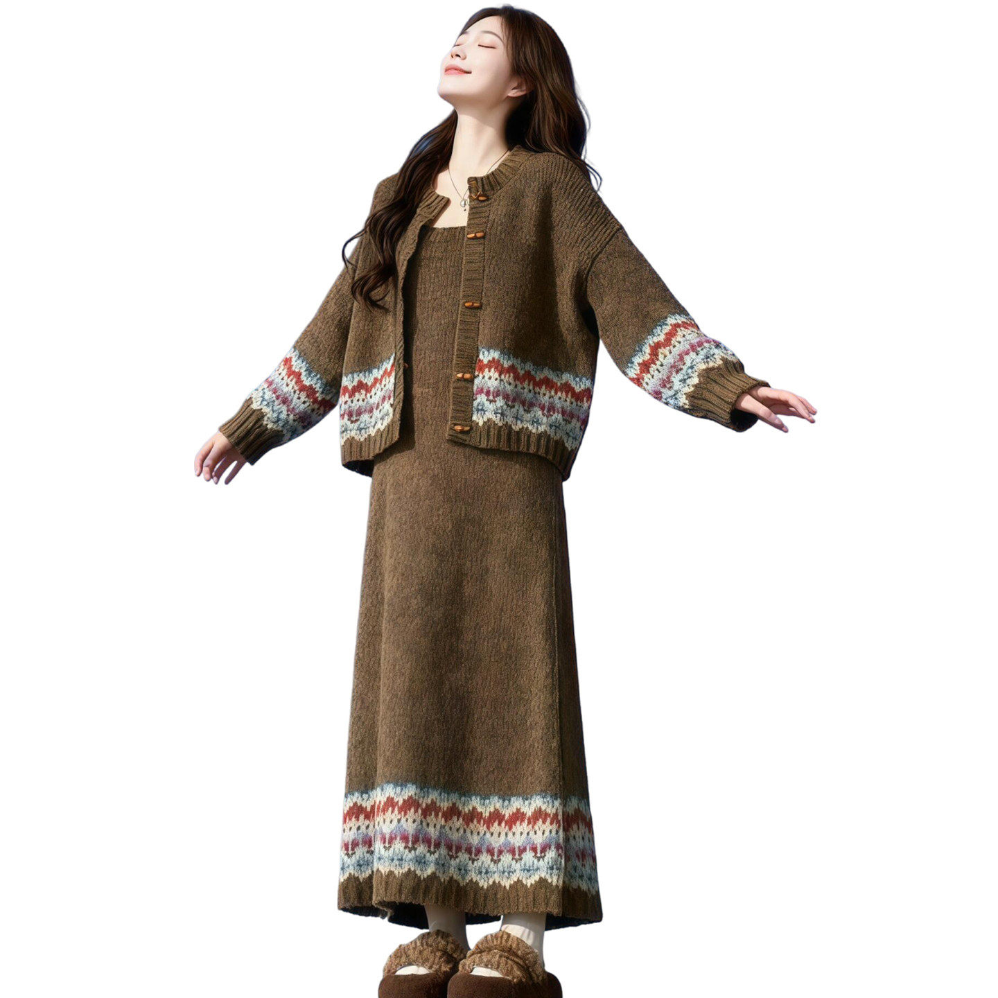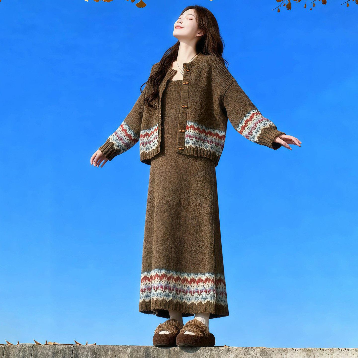 2026新款慵懒风费尔岛针织开衫连衣裙子女春季巨好看松驰套装长裙