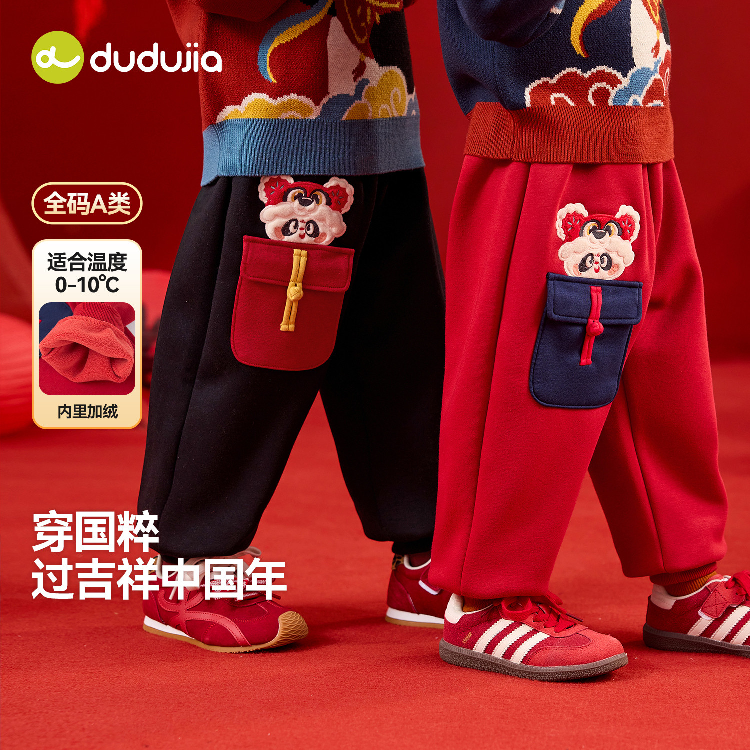 嘟嘟家宝宝拜年服儿童裤子国风女童唐装男童年服长裤男宝年衣红色