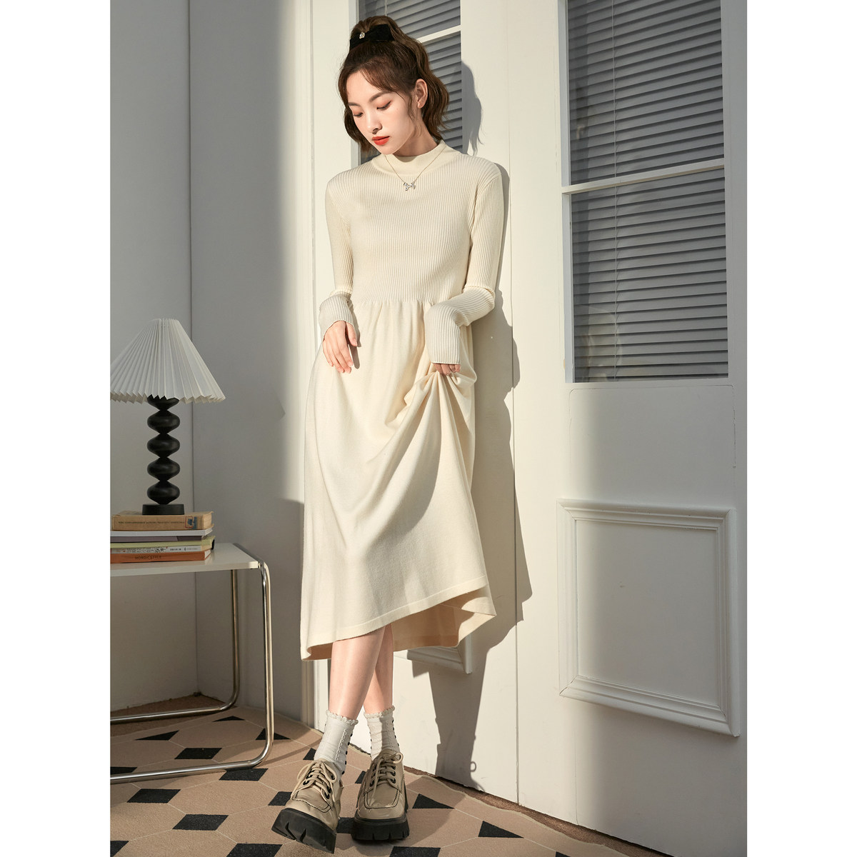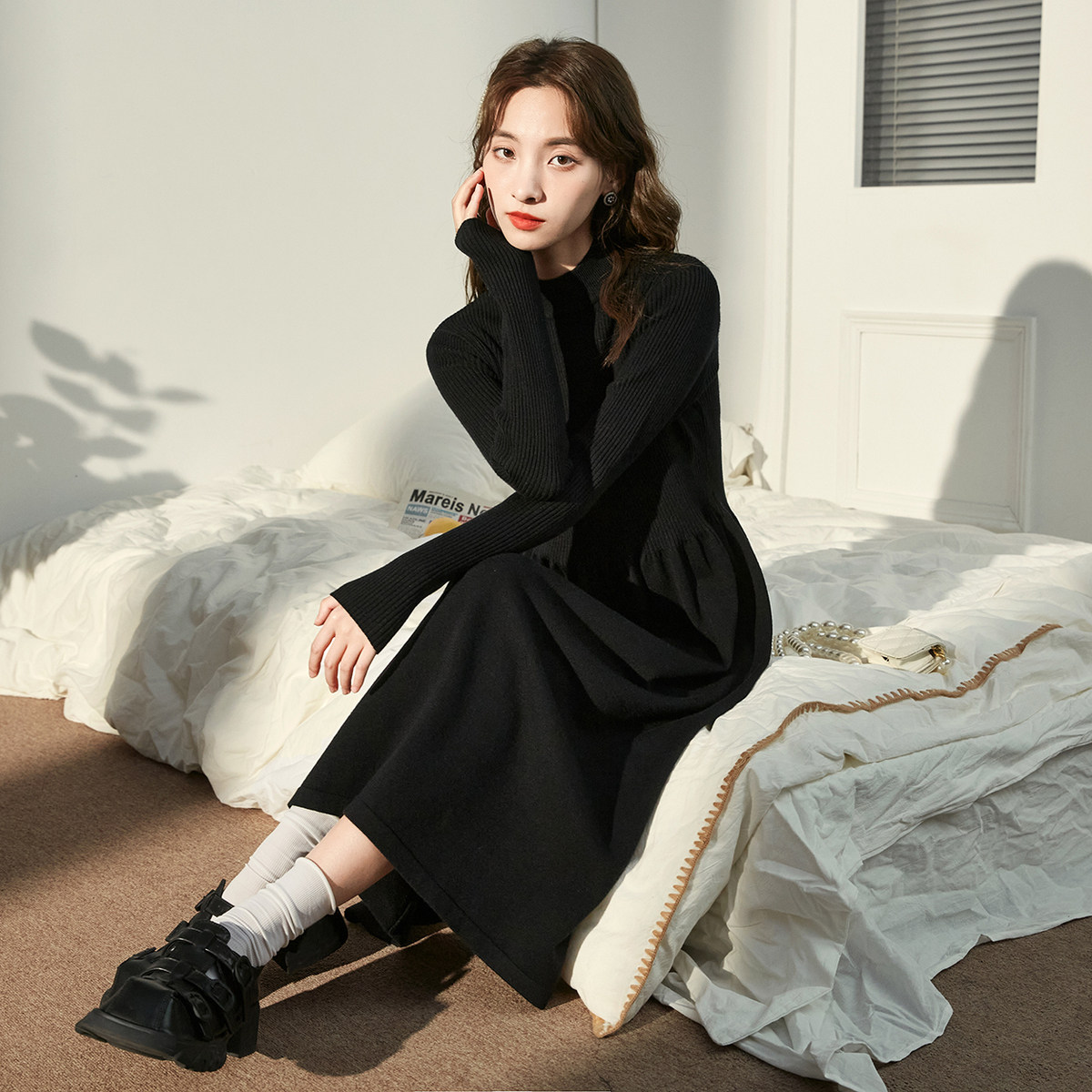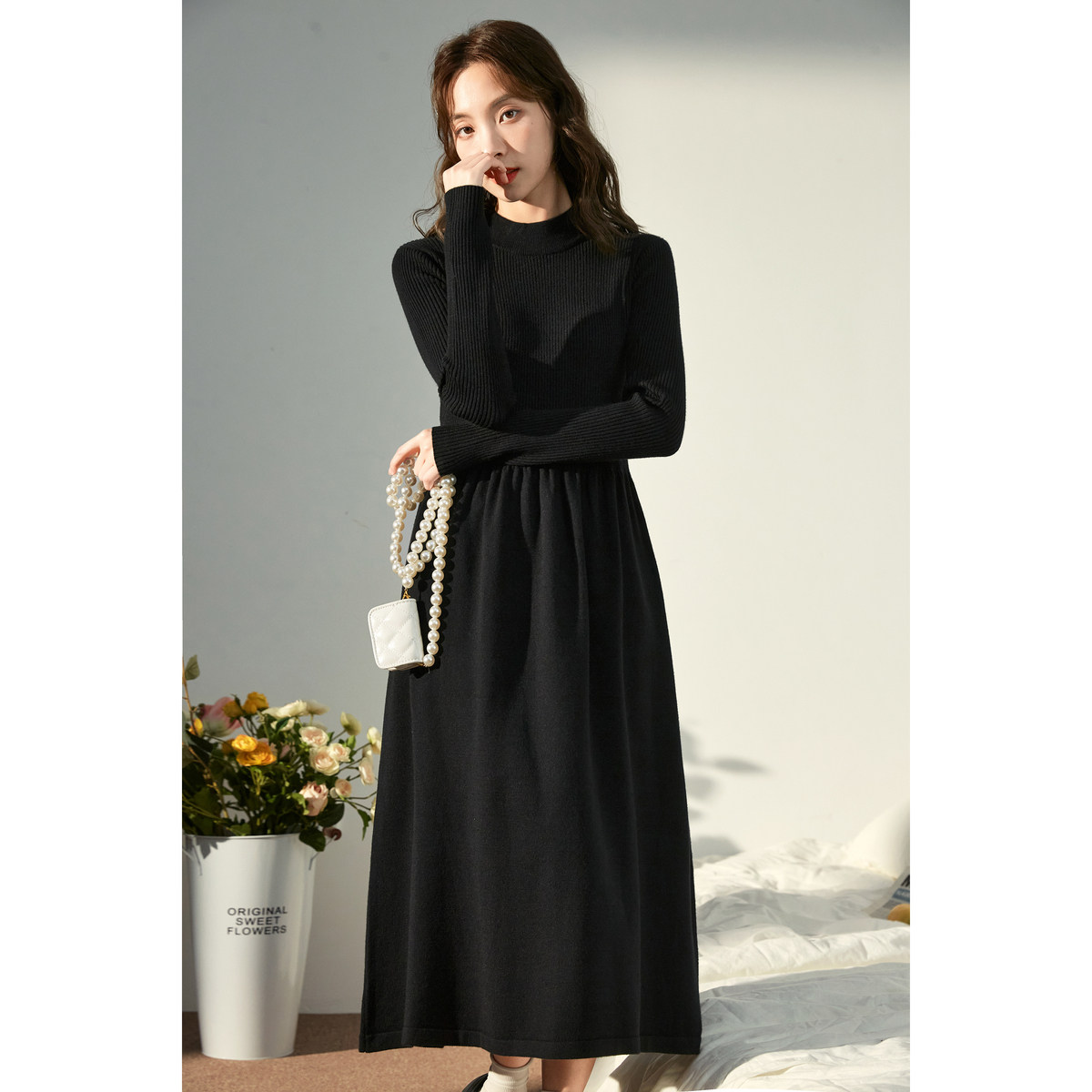 唐狮冬季黑色打底连衣裙女春装新款秋冬内搭中长款针织毛衣裙