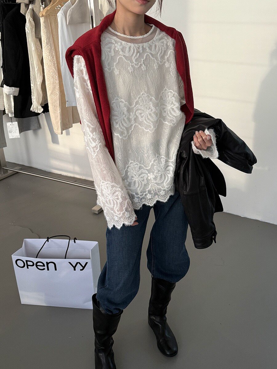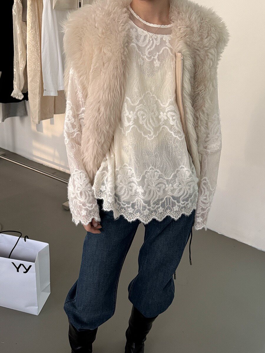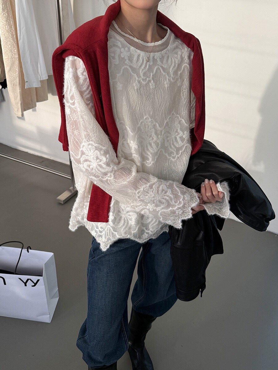 黎诺早春新款韩系水貂毛蕾丝小衫女2026法式复古时尚花边镂空上衣