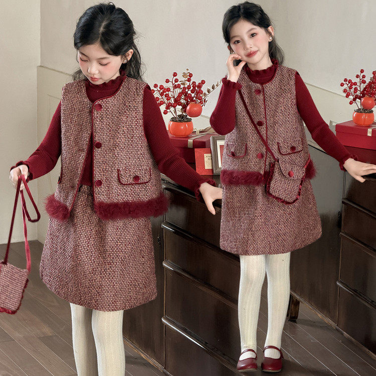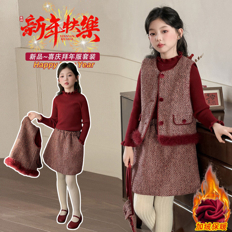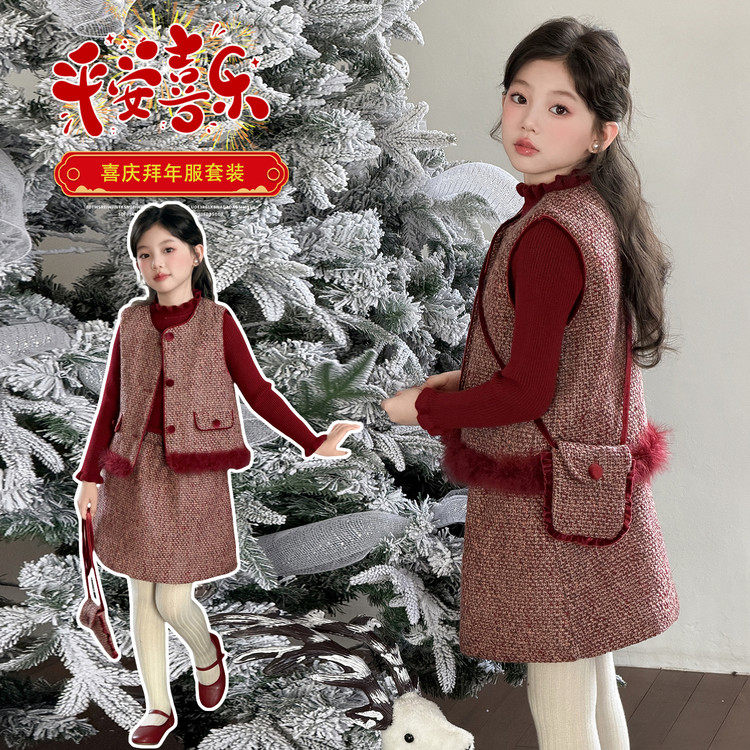 女童小香风连衣裙套装秋冬新款儿童拜年服大童女孩新年裙子三件套