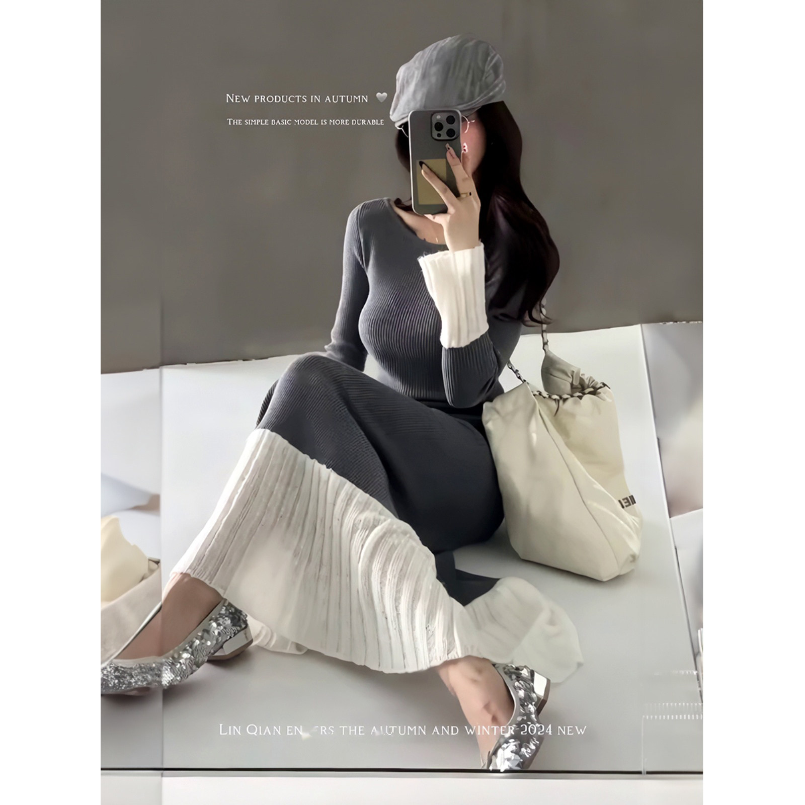 法式灰色针织连衣裙女2025秋冬季配大衣内搭高级感长款到脚踝裙子