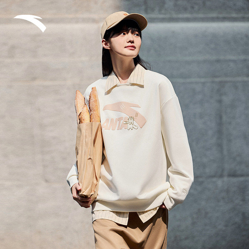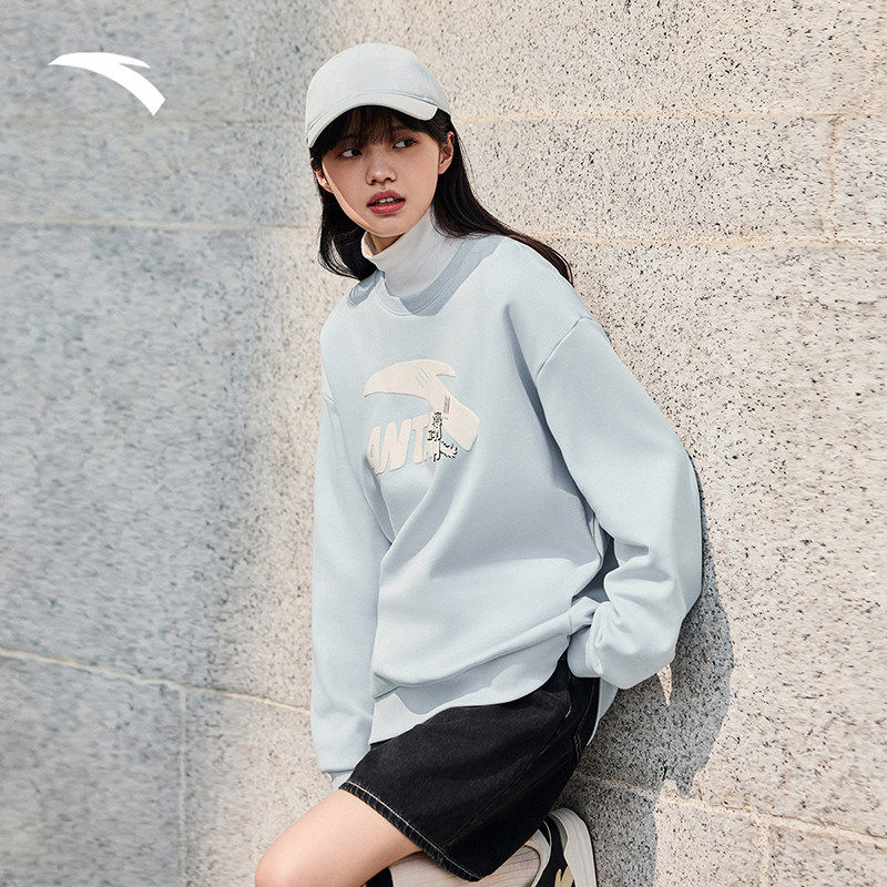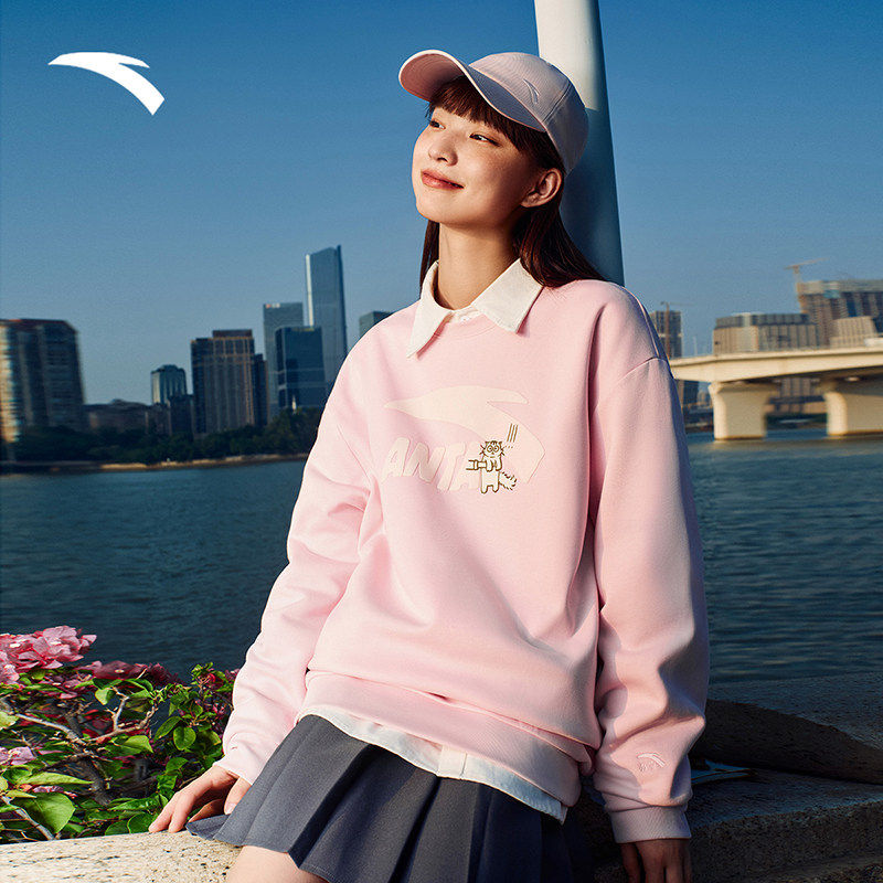 安踏春季新款卫衣女款红色休闲春季宽松针织套头衫学院风运动上衣