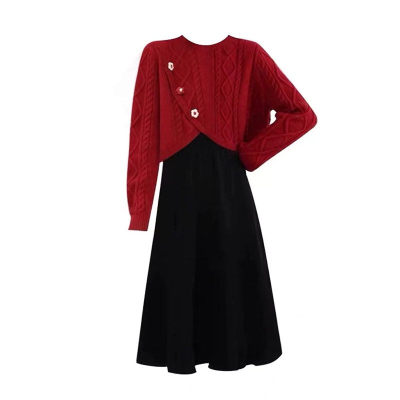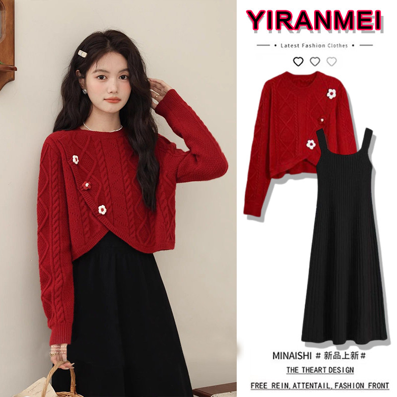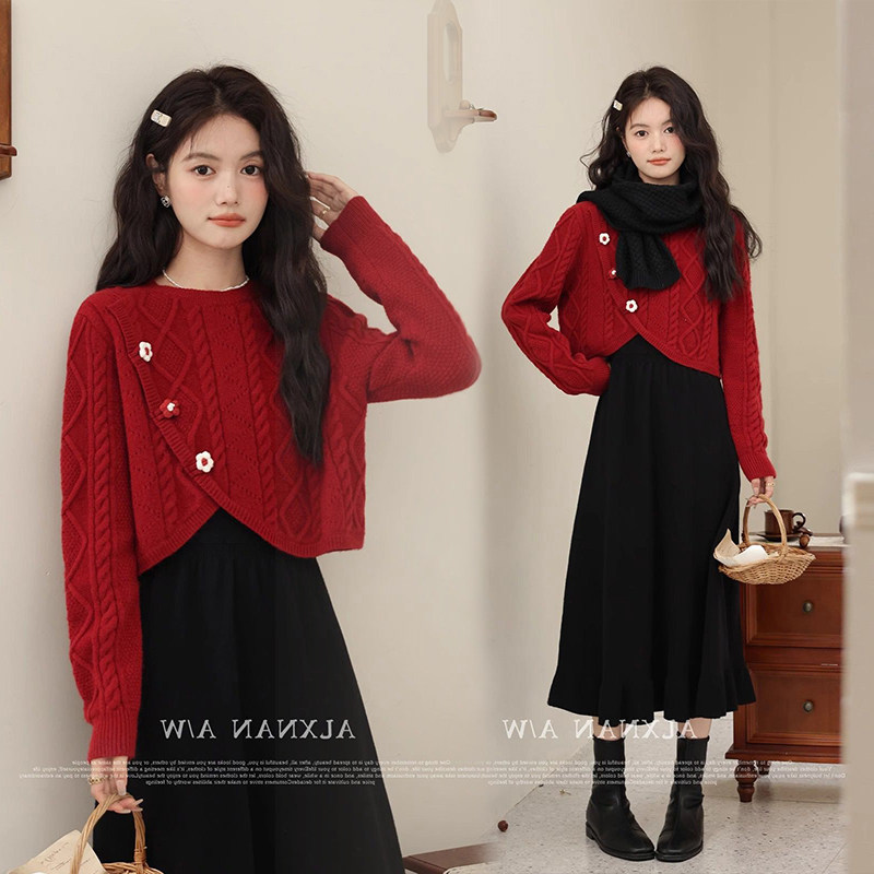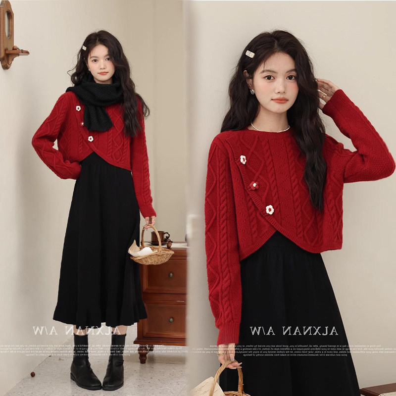 婧麒孕妇装连衣裙红色套装秋冬季2025新款穿搭小个子毛衣裙子周岁