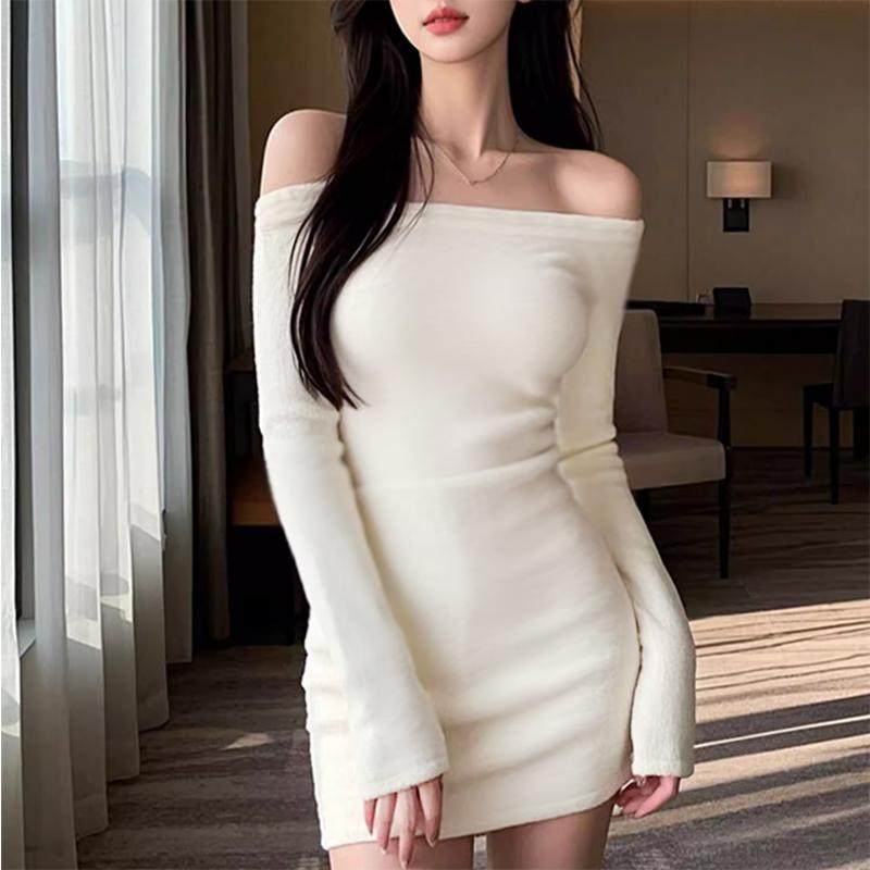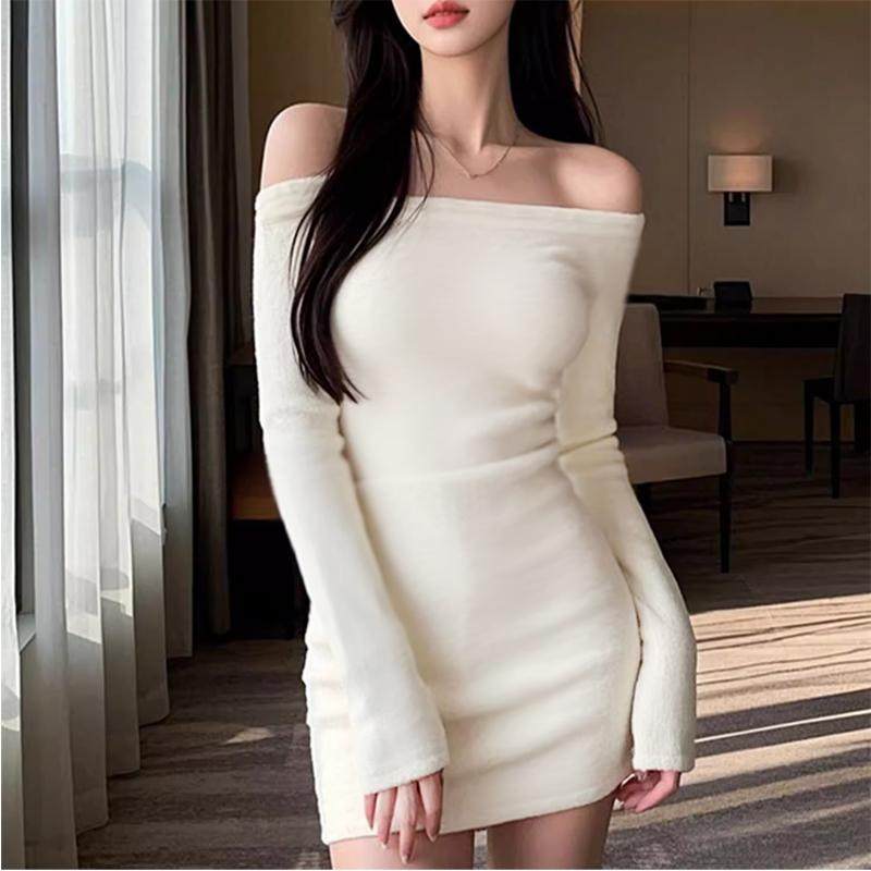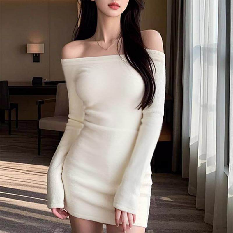 一字领韩式白色露肩长袖连衣裙冬季新款纯欲辣妹风收腰内搭包臀裙