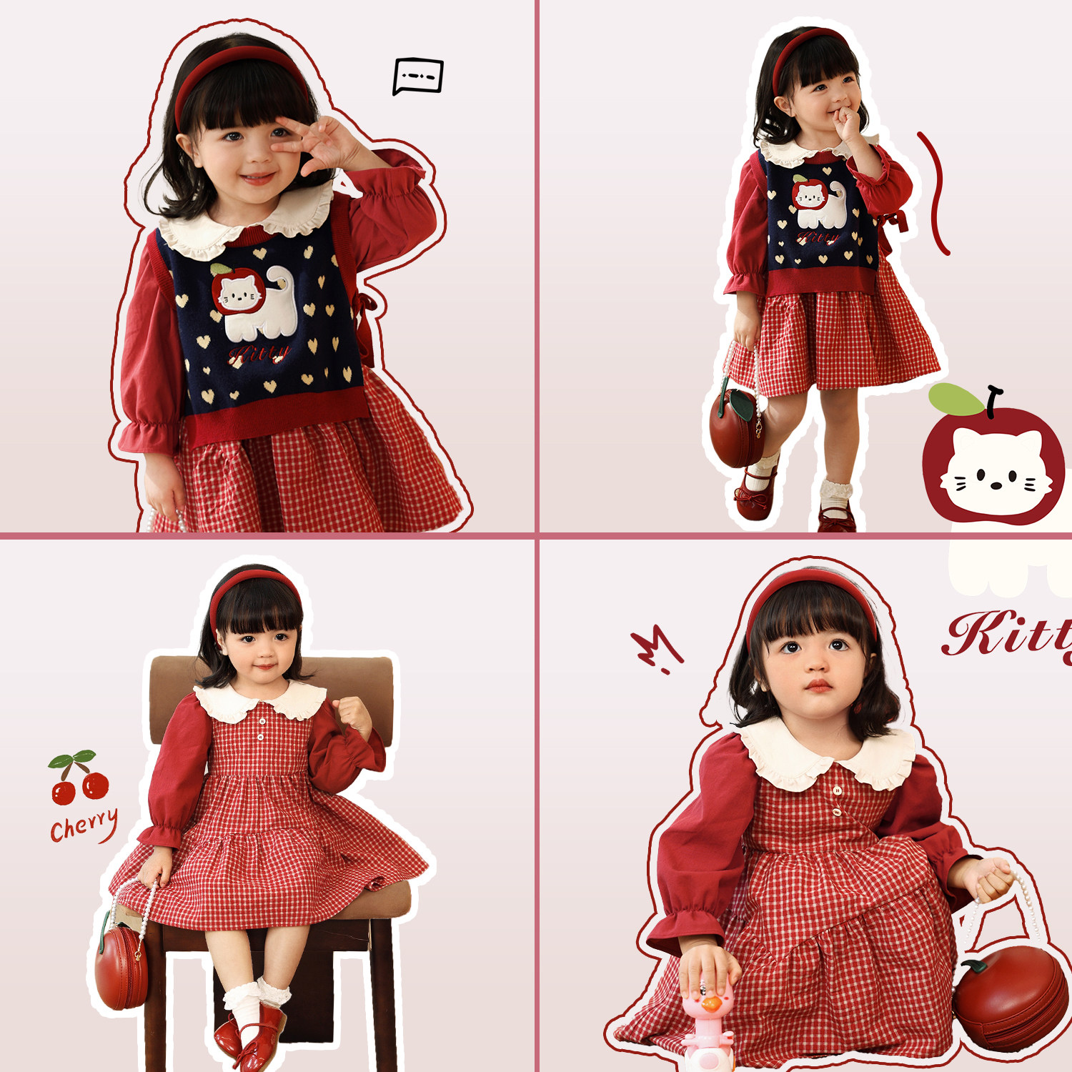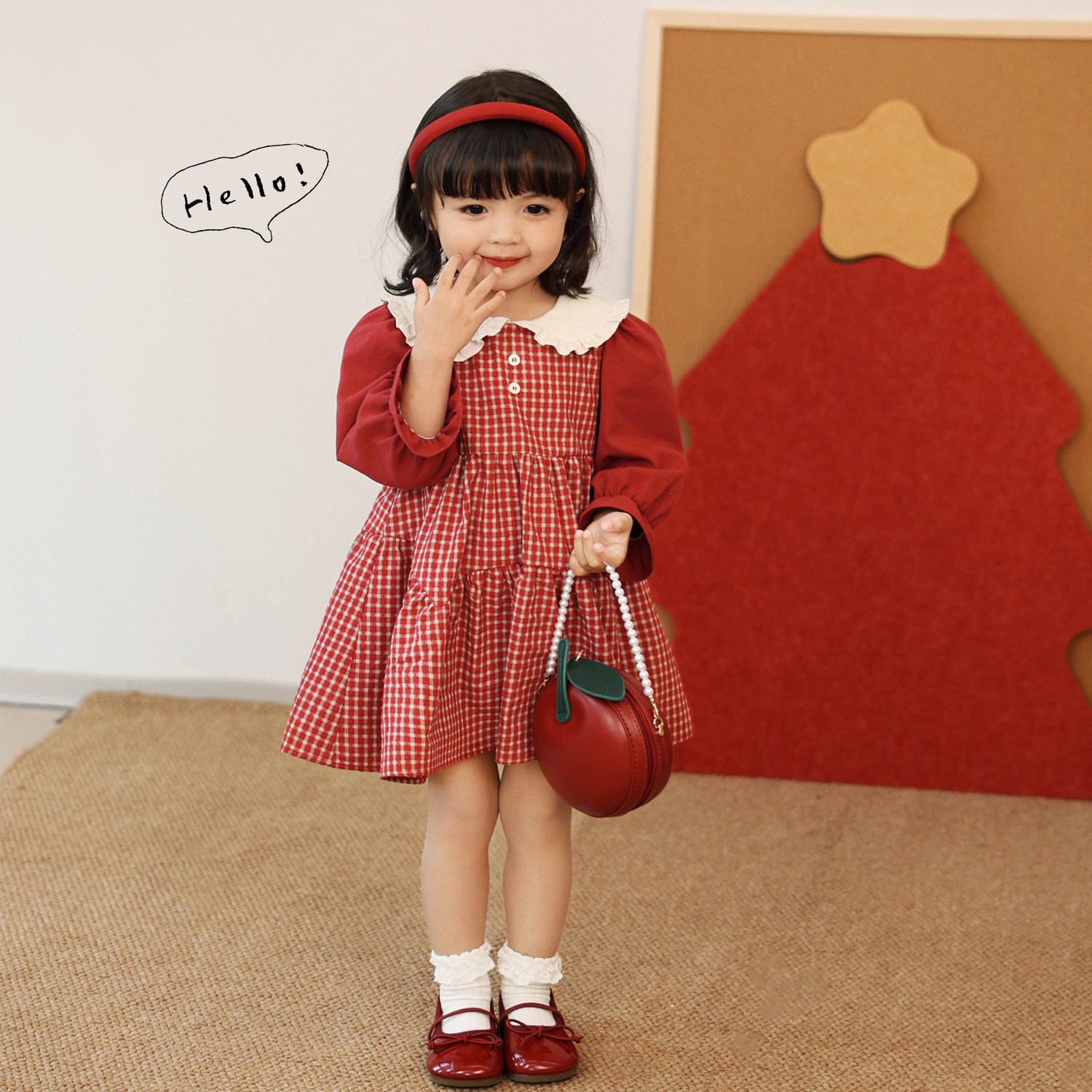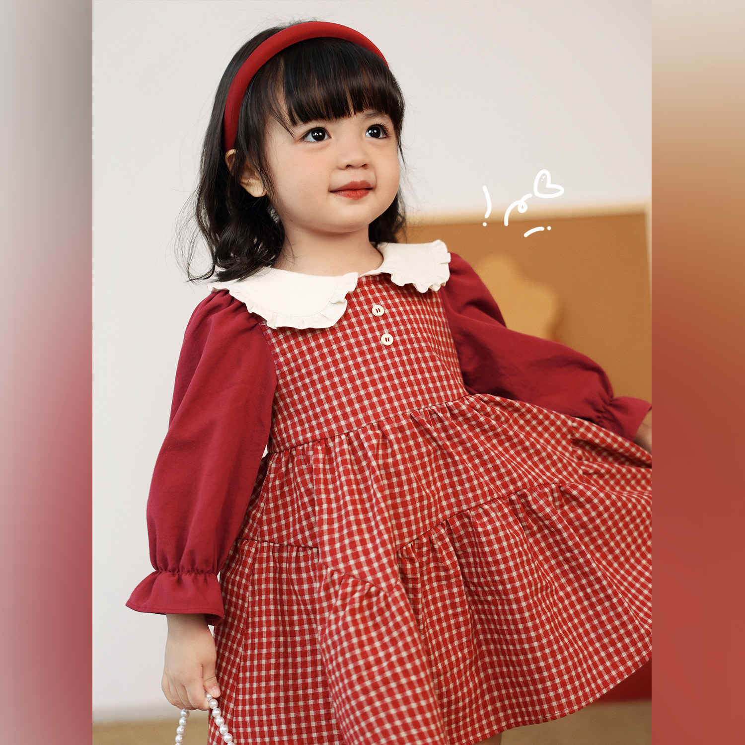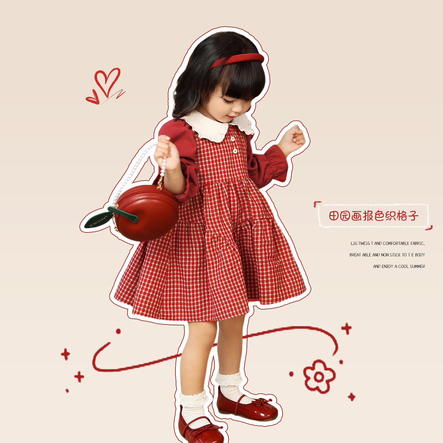 小o爸女婴童 宝宝连衣裙长袖女2026春装新款婴儿红色格纹洋气裙子