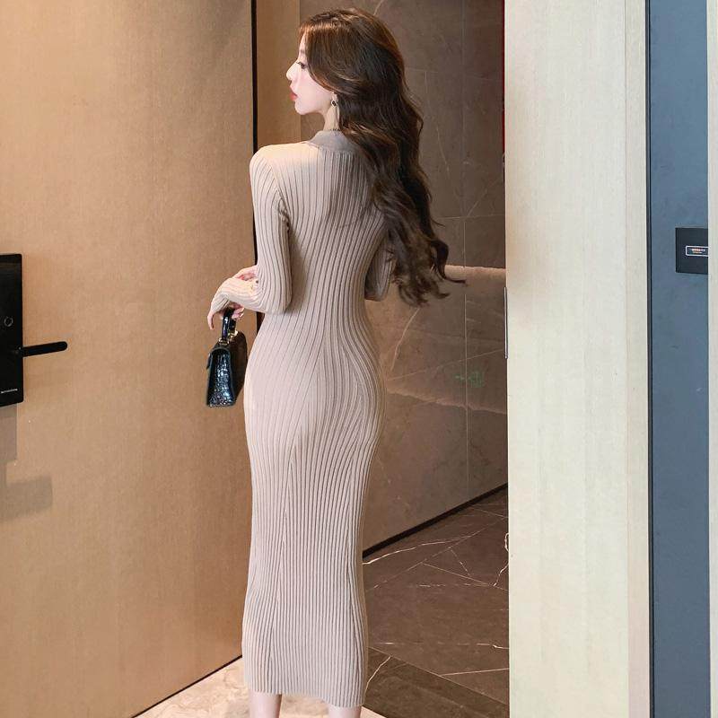 针织连衣裙女秋冬新款过膝长袖修身显瘦百搭气质polo领内搭打底裙