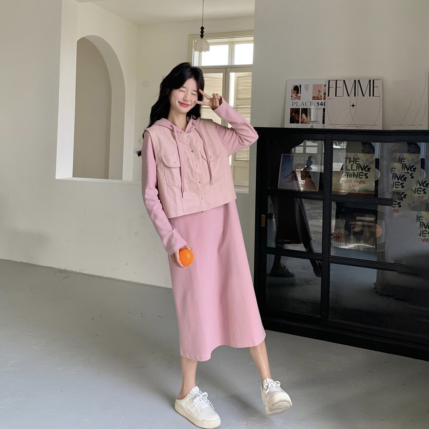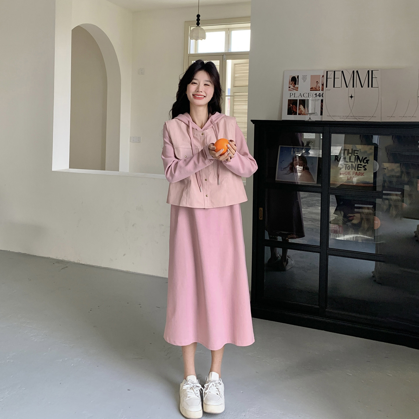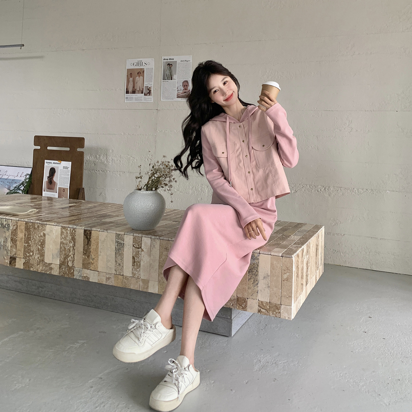 学院风粉色连帽针织卫衣连衣裙套装女春季2026新款流行爆款两件套