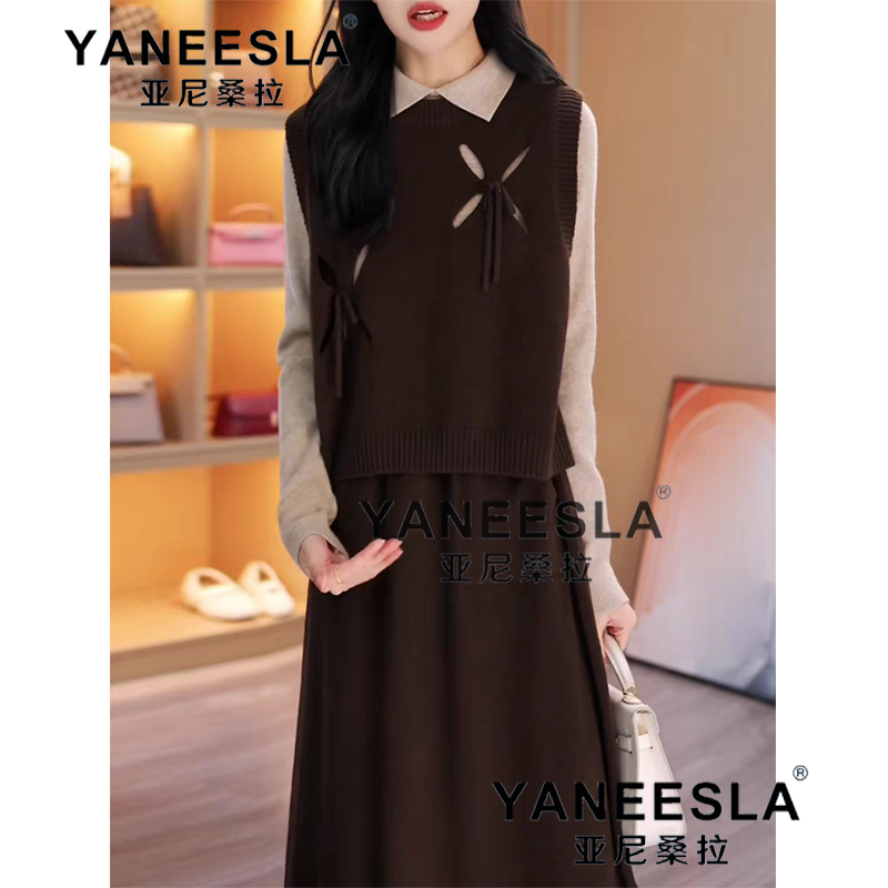加厚马甲两件套针织连衣裙2024秋冬新款女配大衣中长款打底裙套装