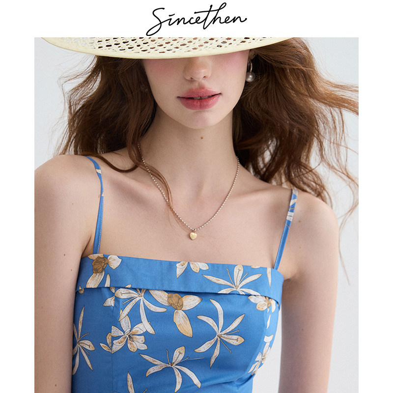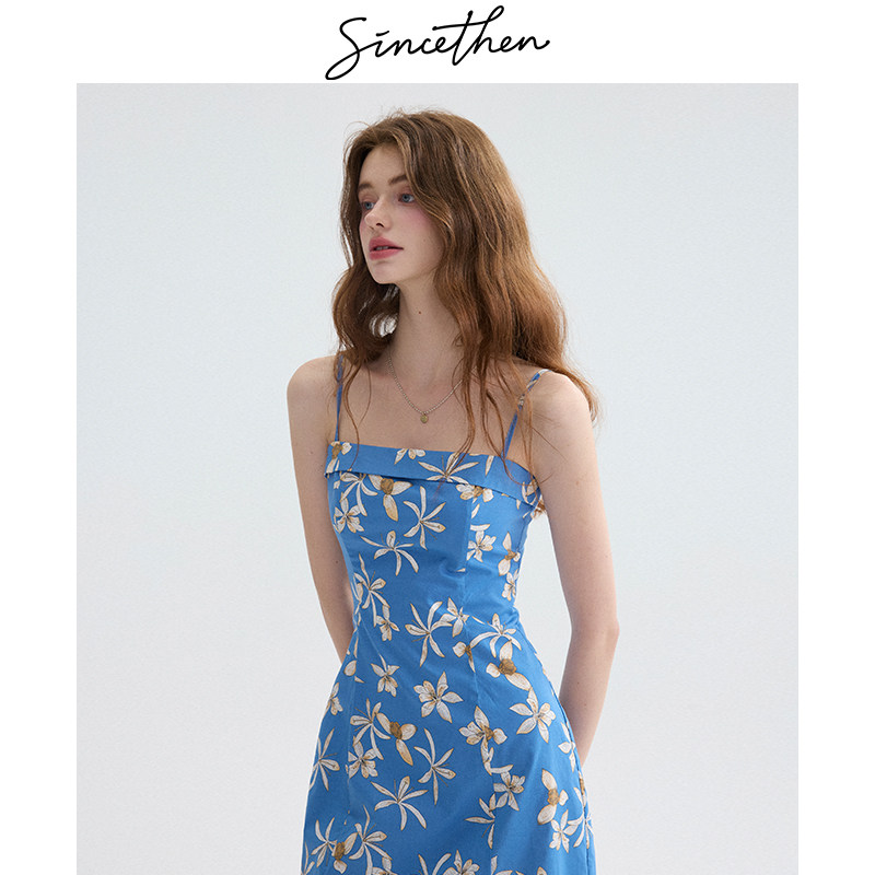 sincethen法式碎花吊带裙蓝色连衣裙短款裙子小个子度假短裙女夏