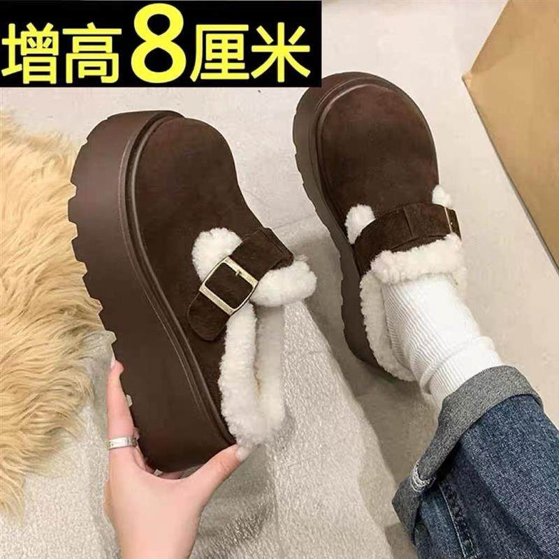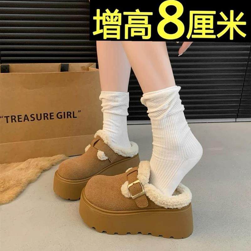 品牌厚底勃肯棉拖鞋女秋冬加绒小个子8cm增高坡跟松糕包头半拖鞋