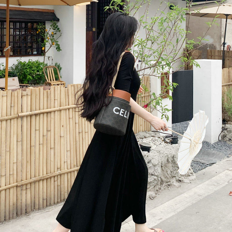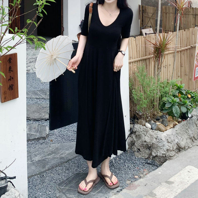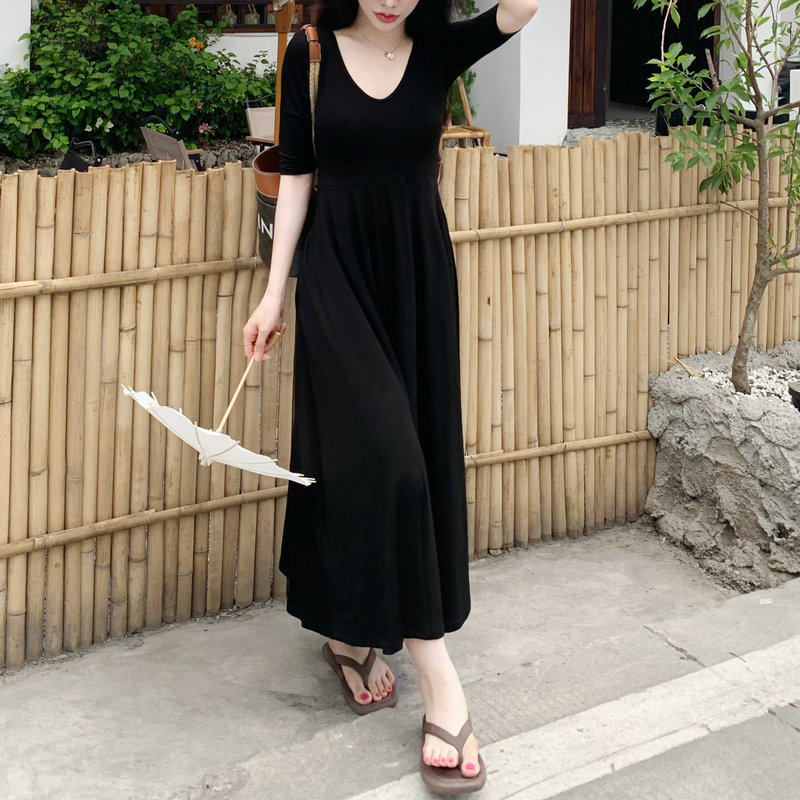 惊艳黑色V领高腰修身A字连衣裙长款春夏口袋长裙收腰中袖莫代尔女