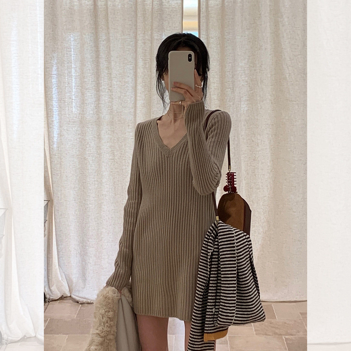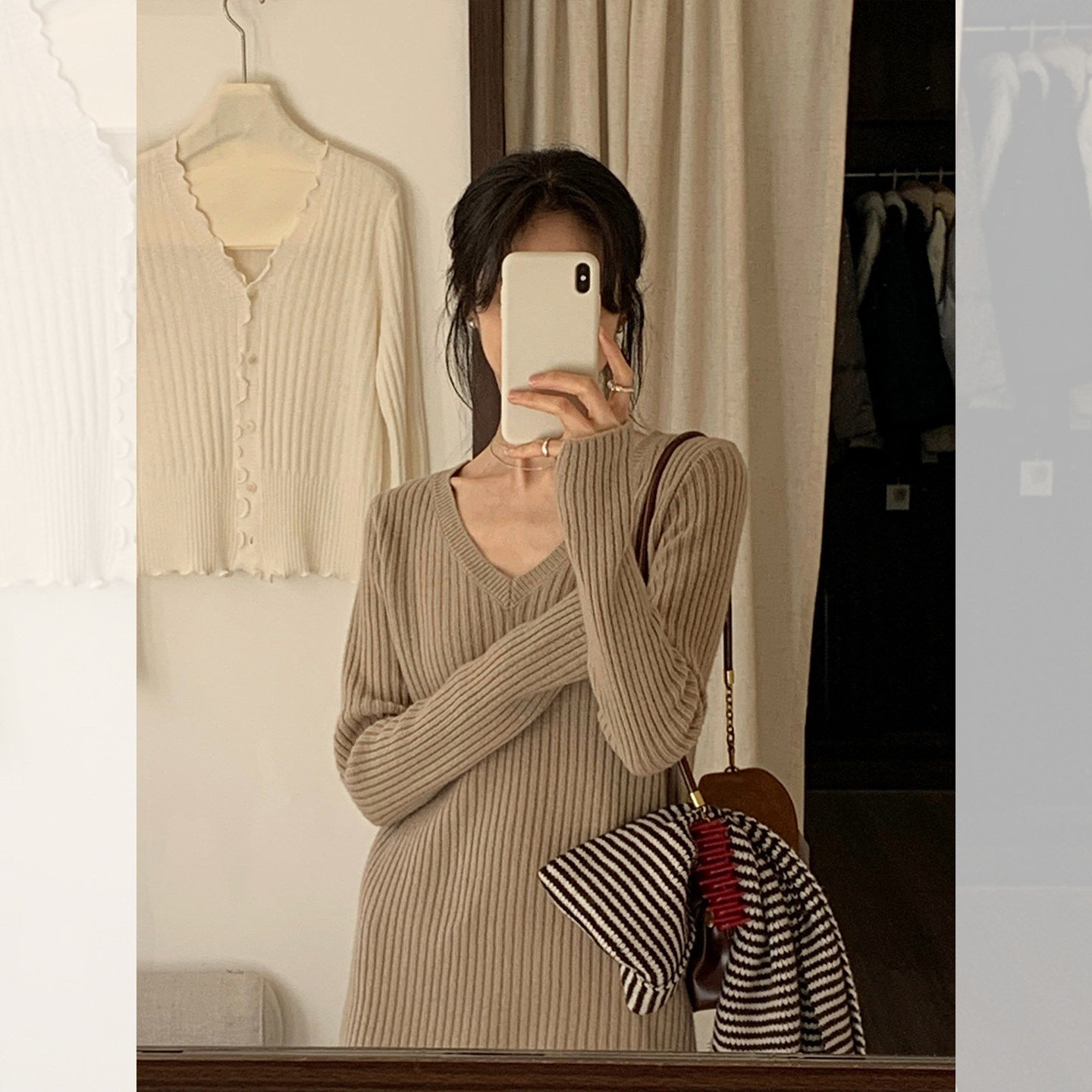 卡其色v领中长款针织衫女秋冬遮屁股宽松连衣裙毛衣内搭打底上衣