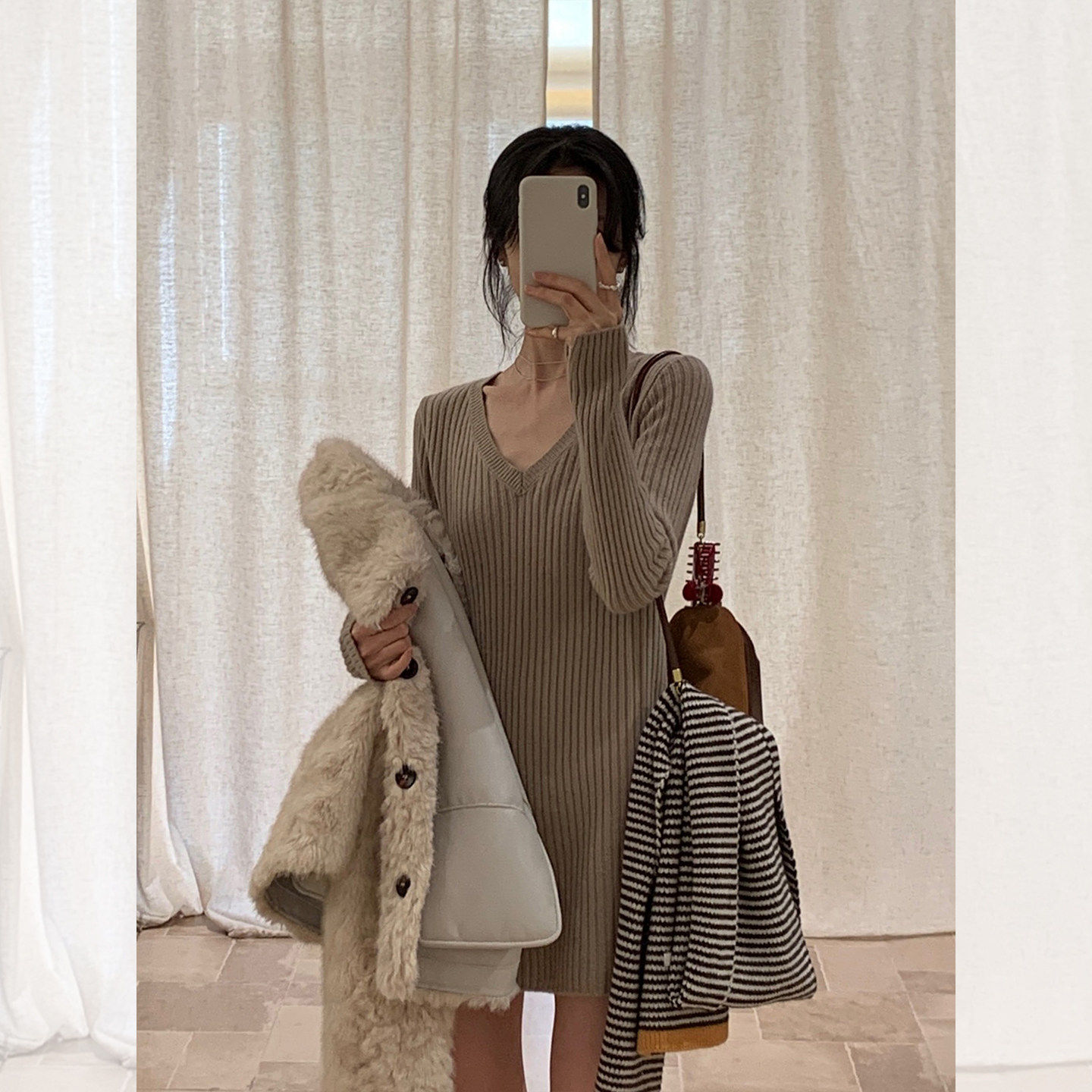 311线报网描述:遮屁股v领中长款针织衫内搭连衣裙毛衣上衣
