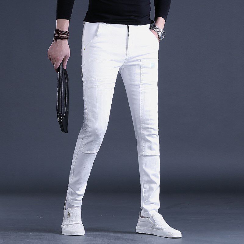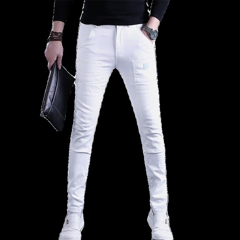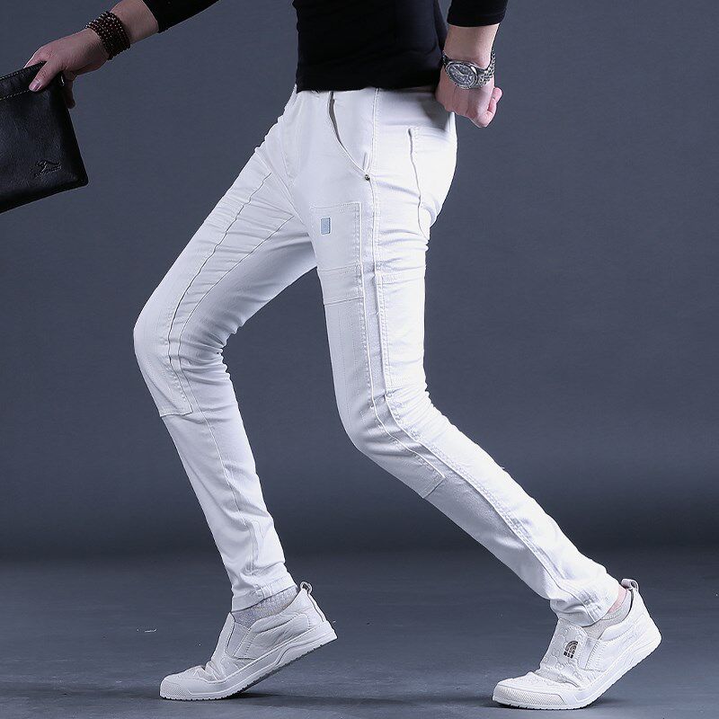 白色裤子男秋季新款牛仔裤男士y潮牌修身小脚拼接潮流长裤青年男