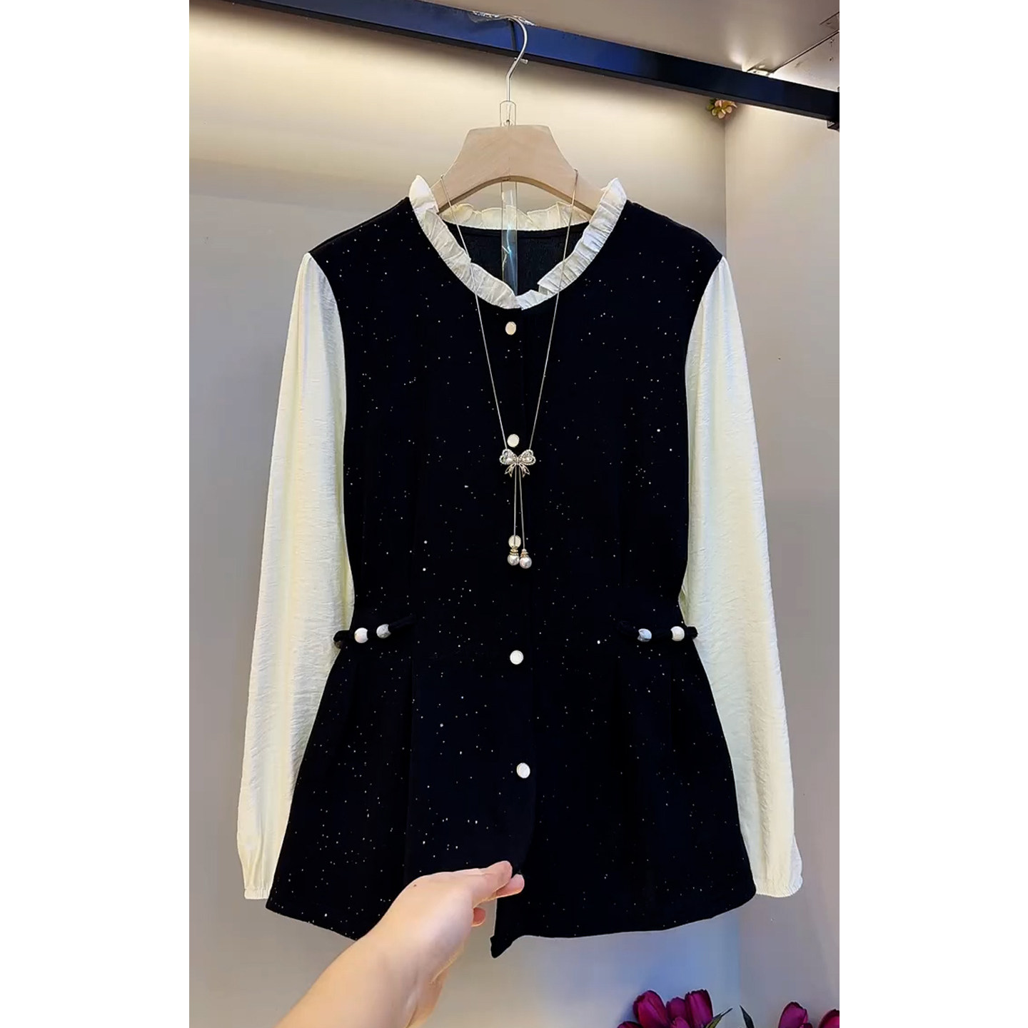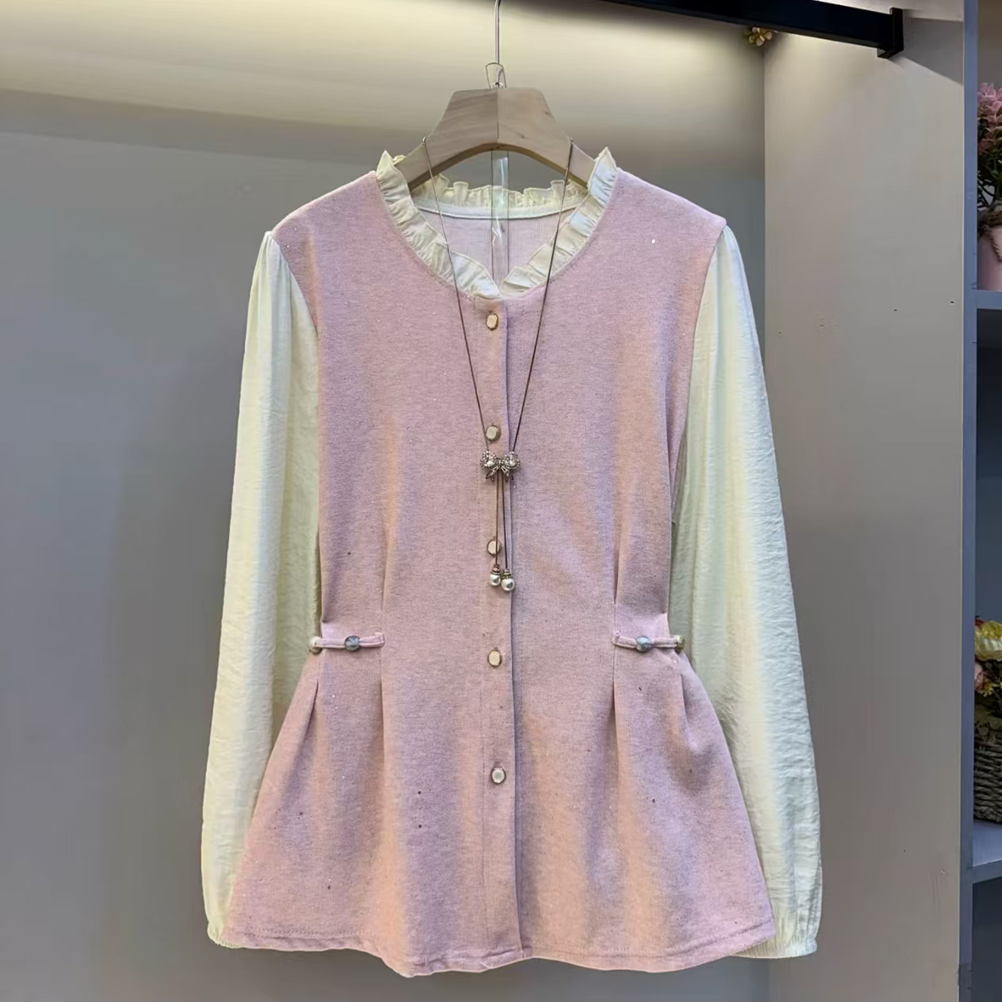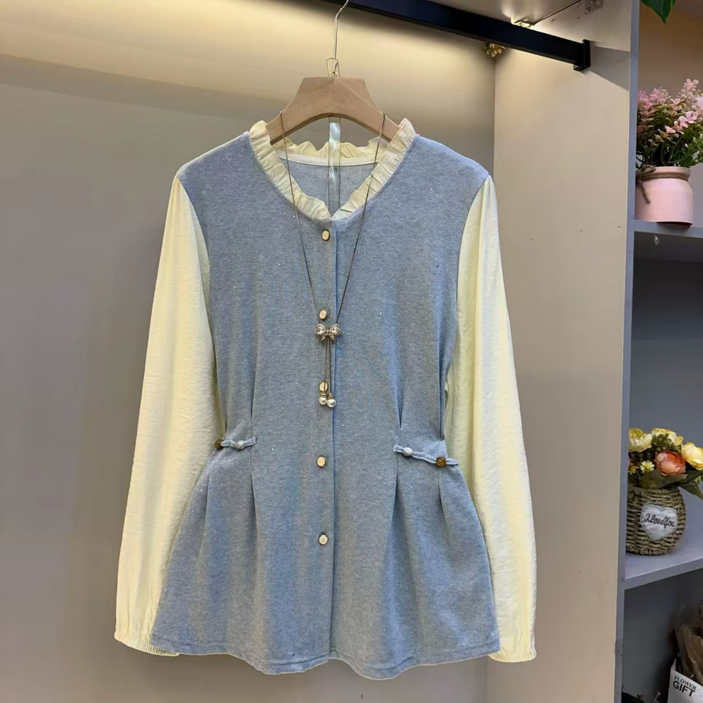 大码2026春季显瘦新款上衣mm洋气减龄假两件法式遮肉长袖遮肚衬衫