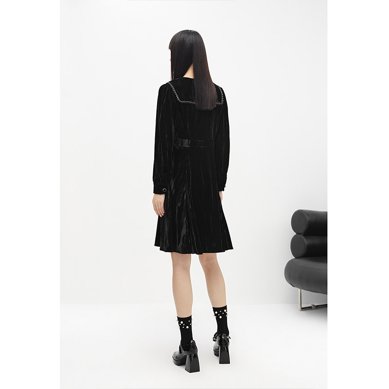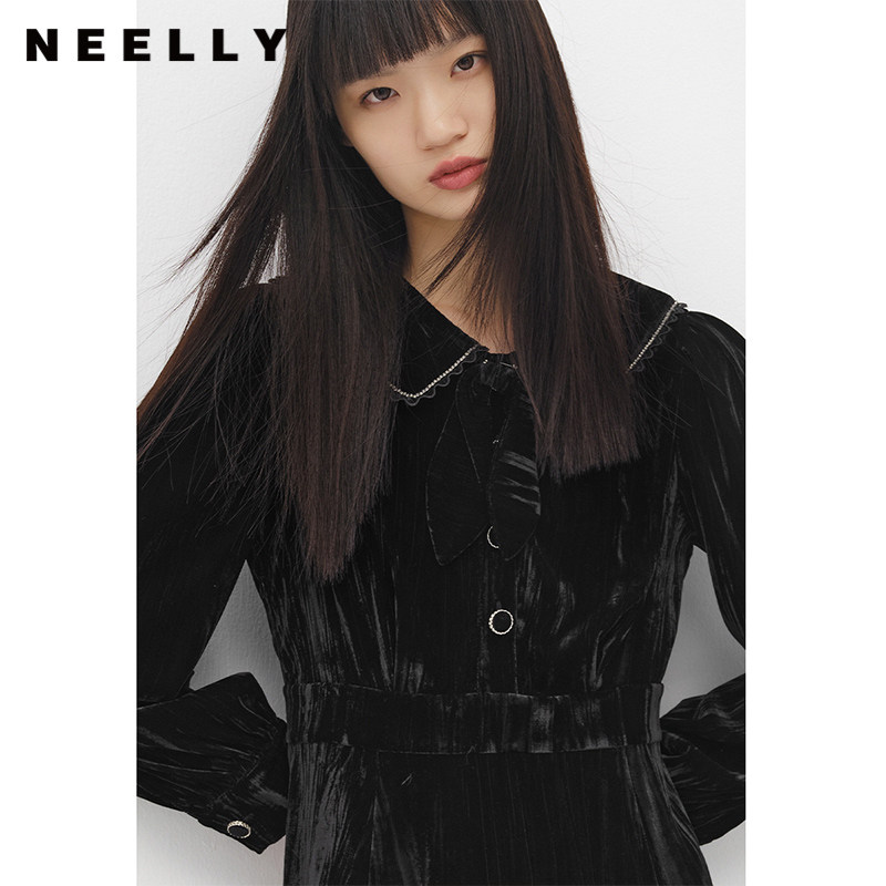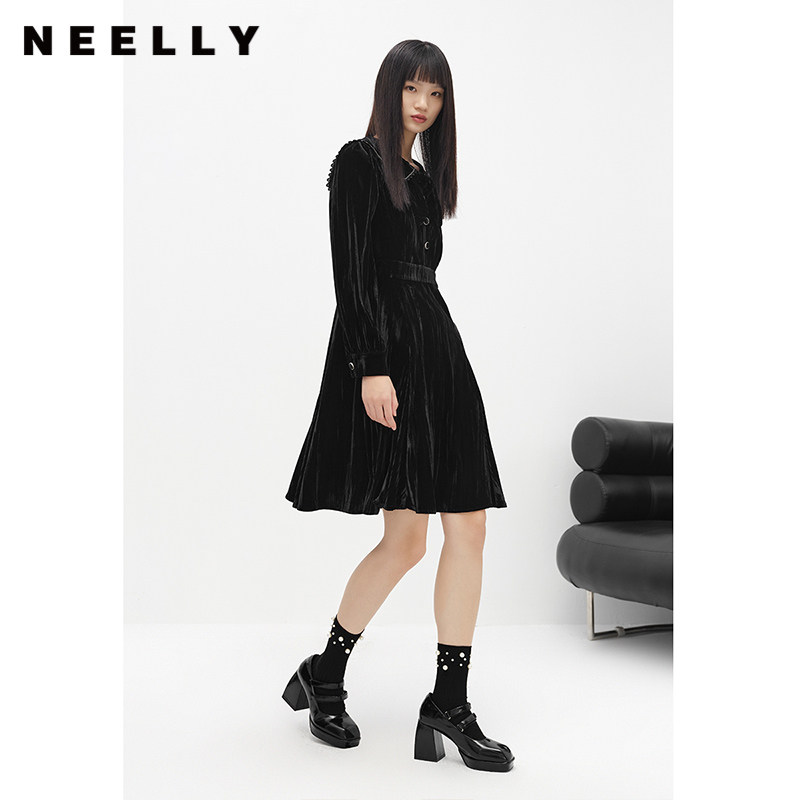 NEELLY纳俪商场同款黑色丝绒连衣裙女中长款收腰A字裙摆百搭时尚