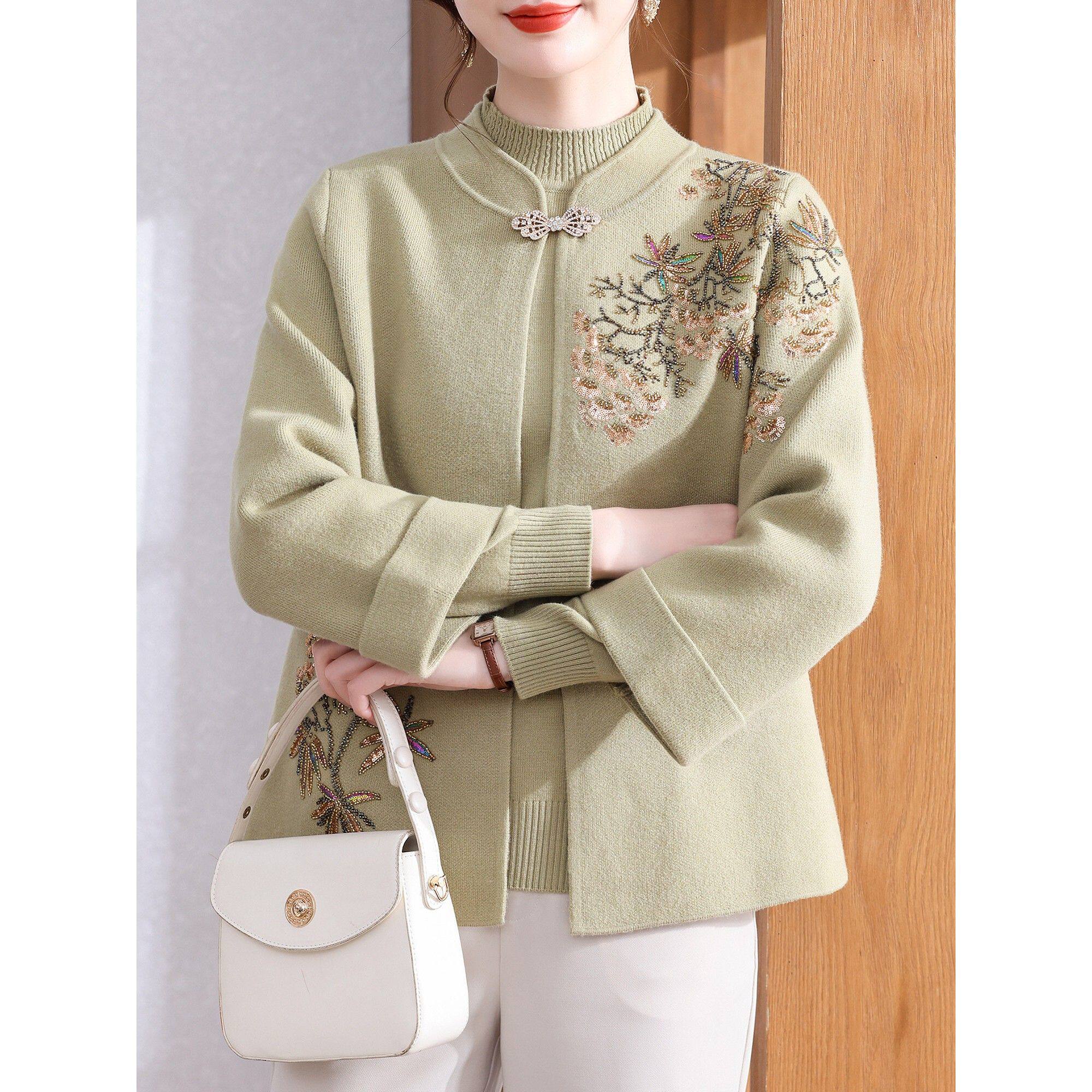 妈妈秋冬装国风针织衫套装2025新款洋气中老年女装红色上衣两件套
