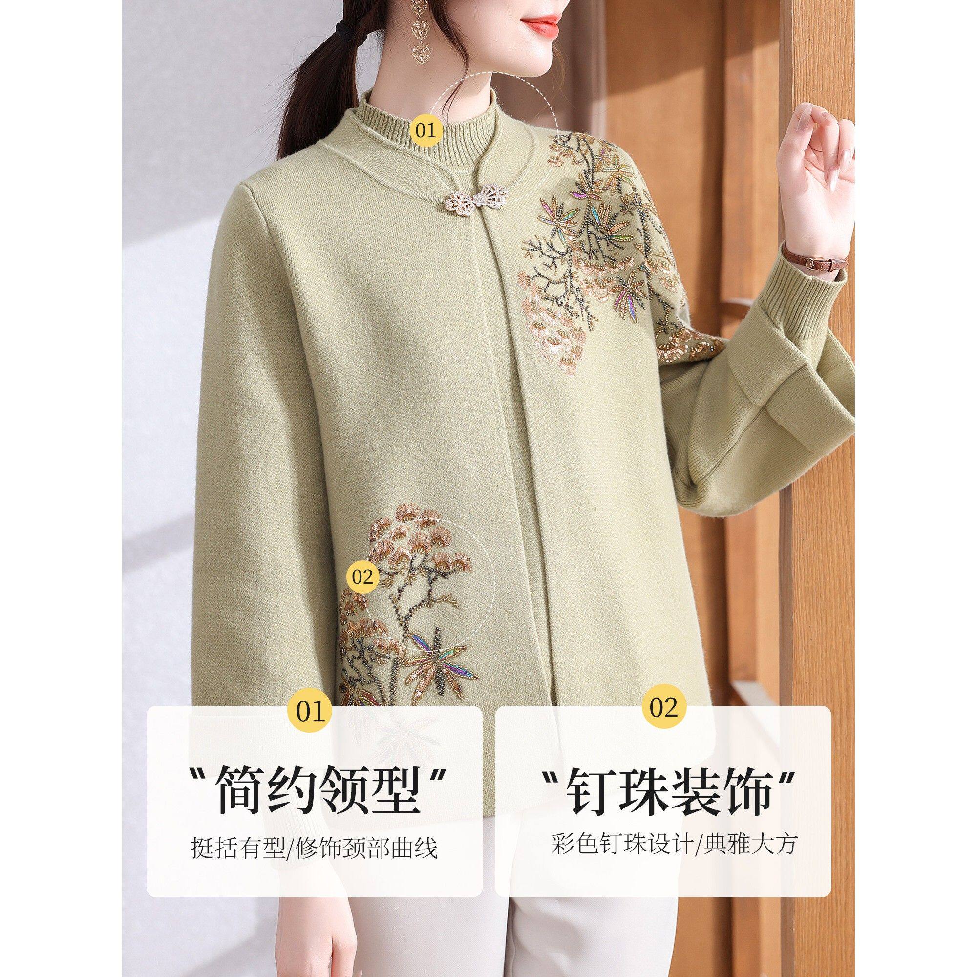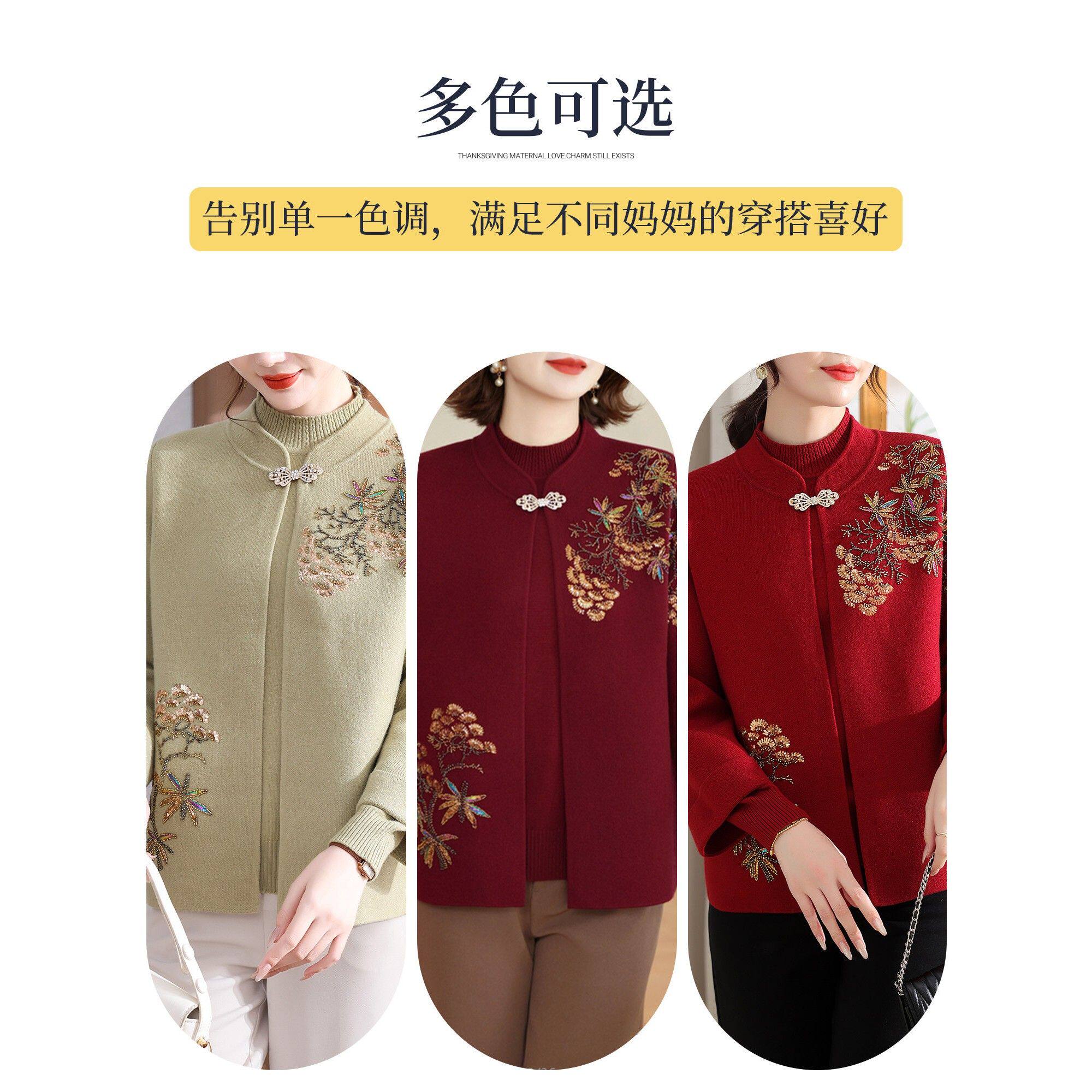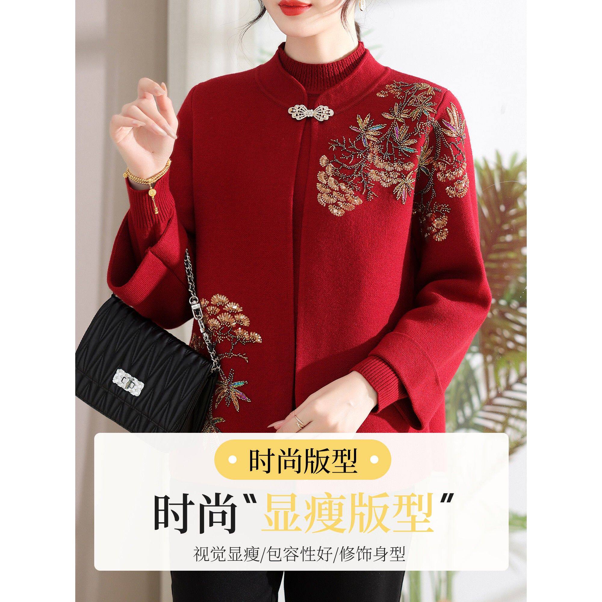 妈妈秋冬装国风针织衫套装2025新款洋气中老年女装红色上衣两件套