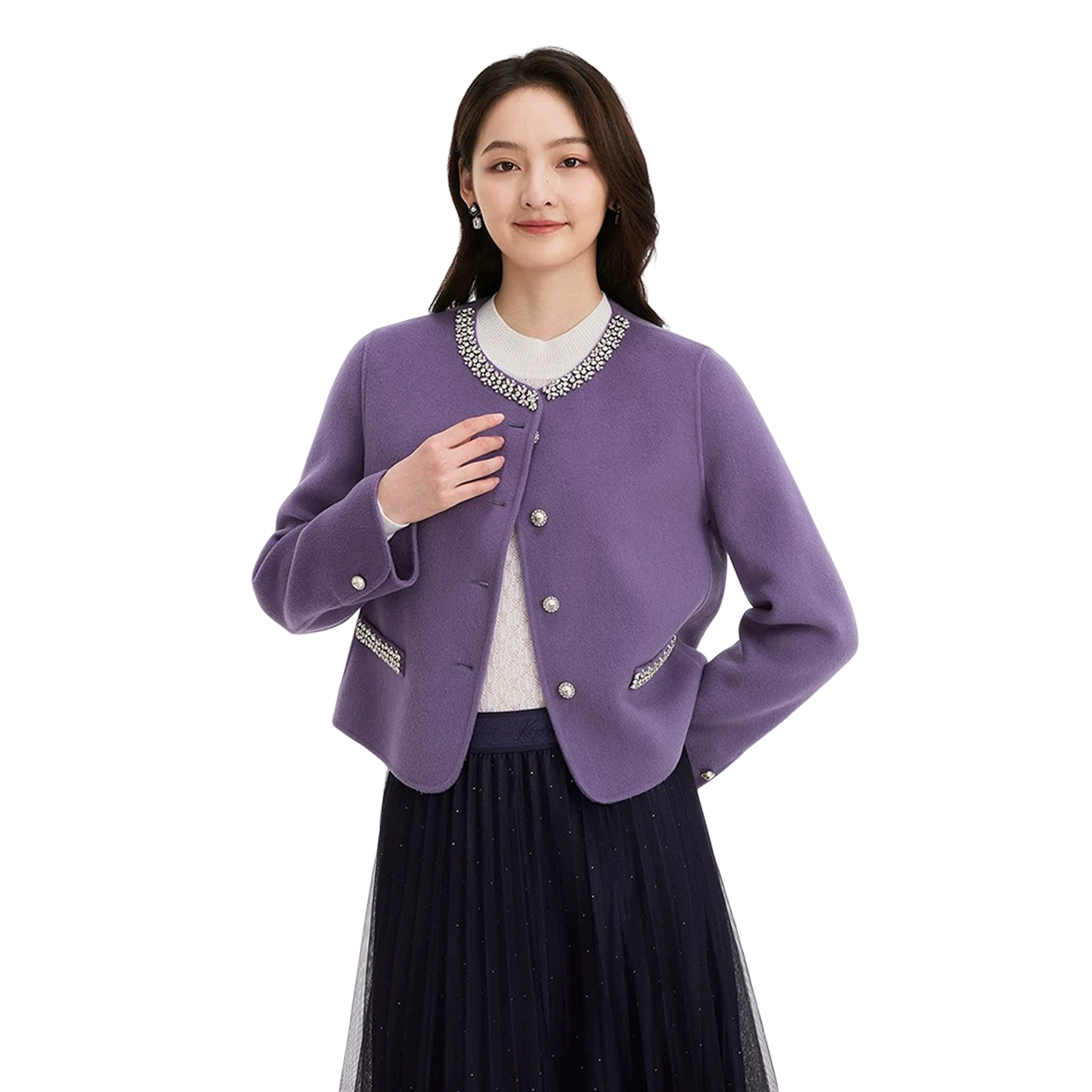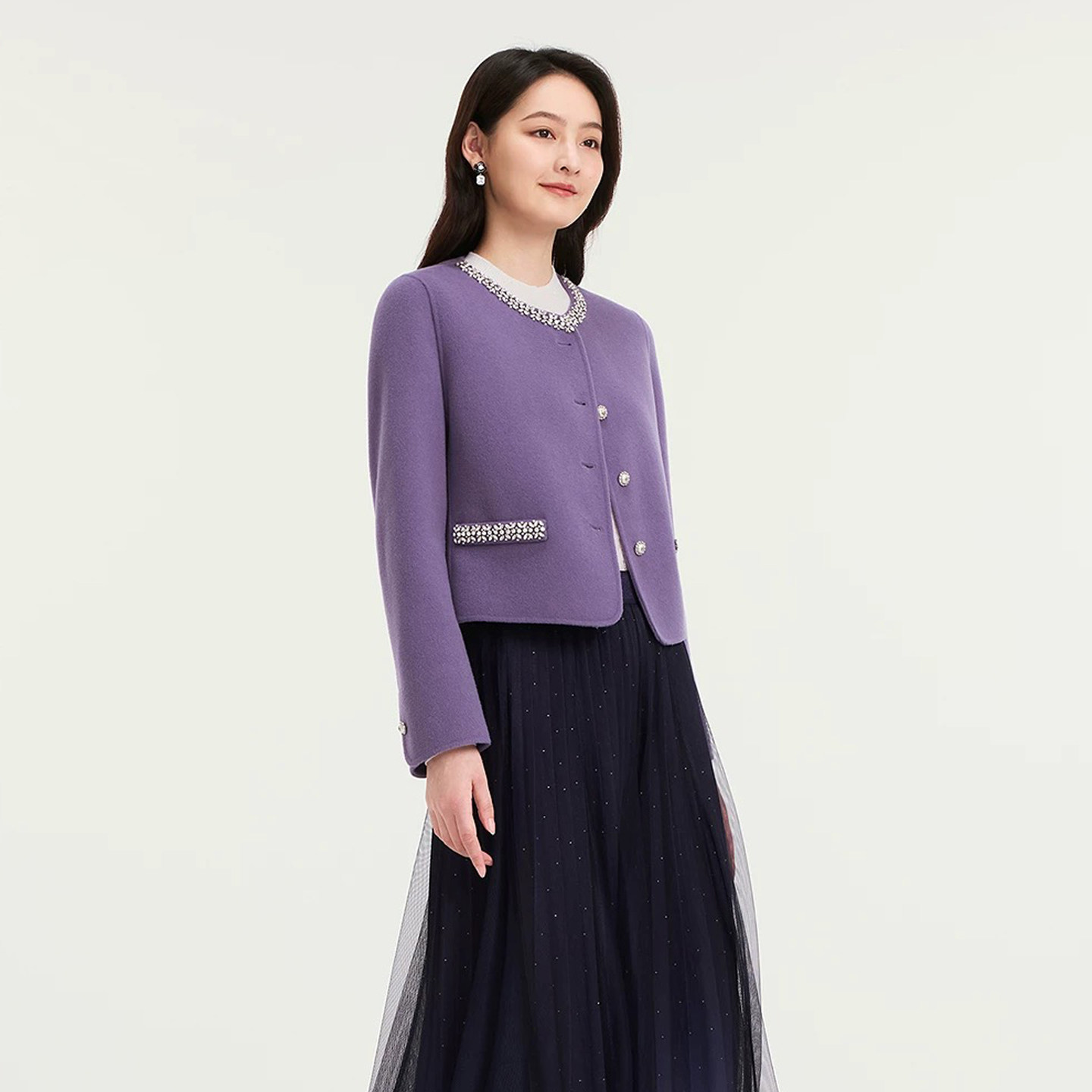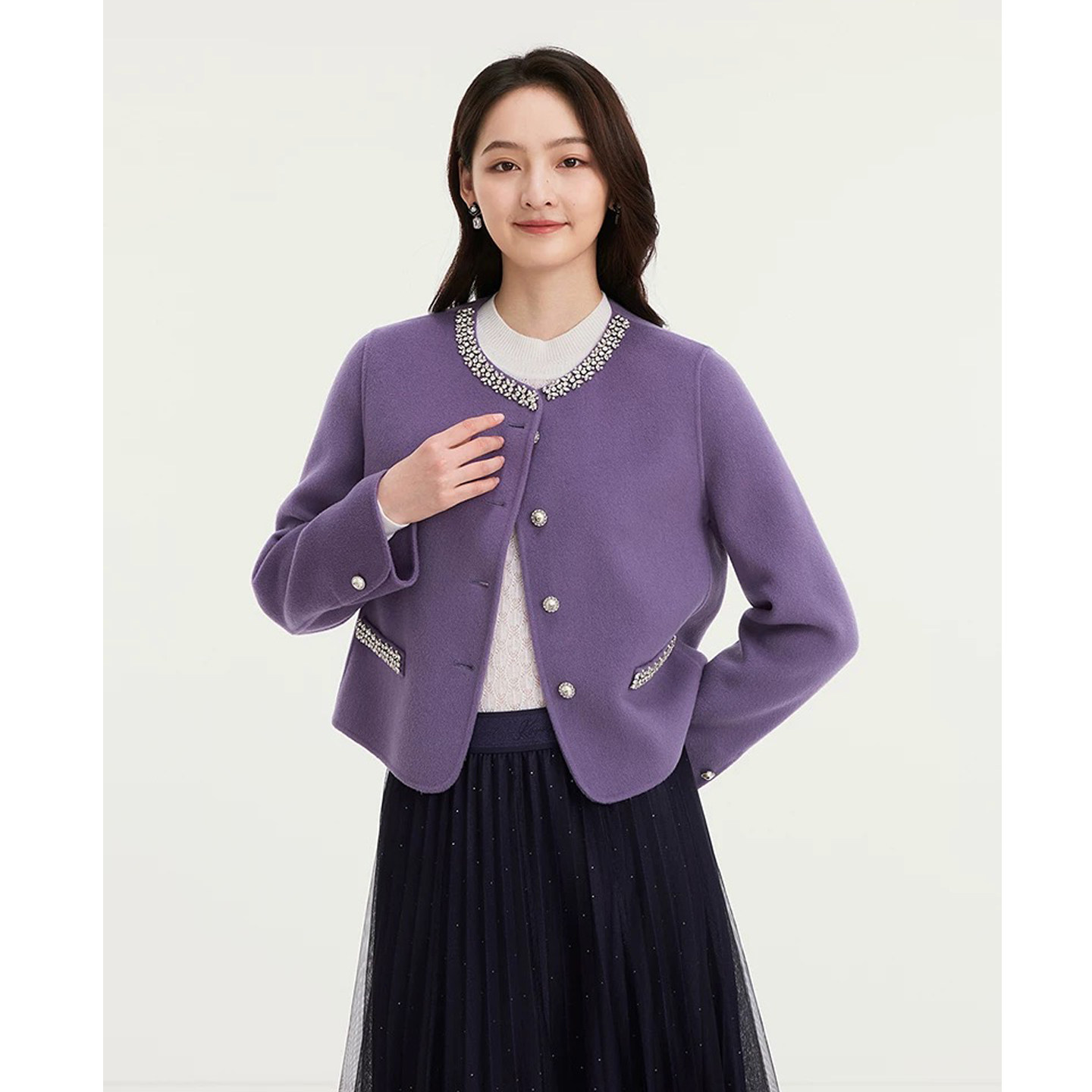 珂莱商场同款2025冬季新款女装紫色百搭小香风羊毛双面呢大衣外套