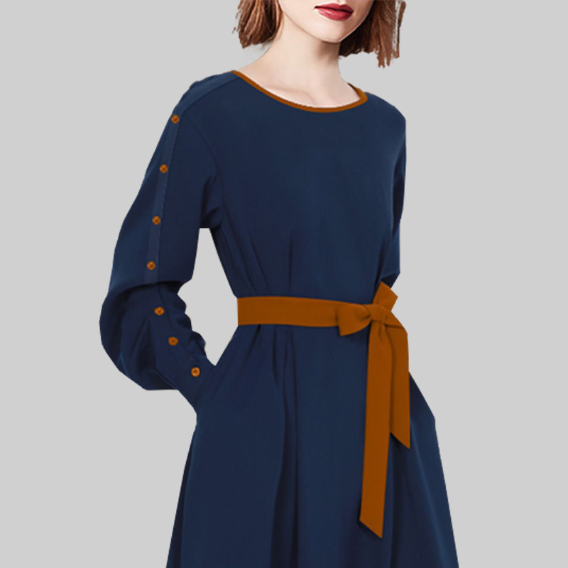 法式蓝色长袖连衣裙女2026新款春季赫本风别致系带收腰显瘦中长裙