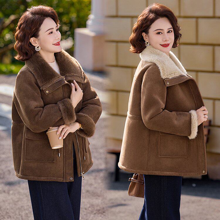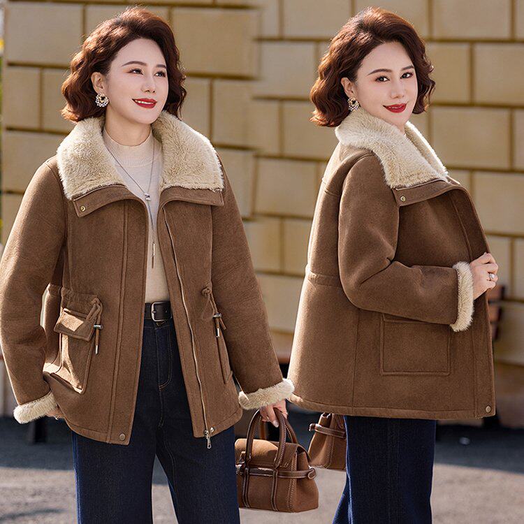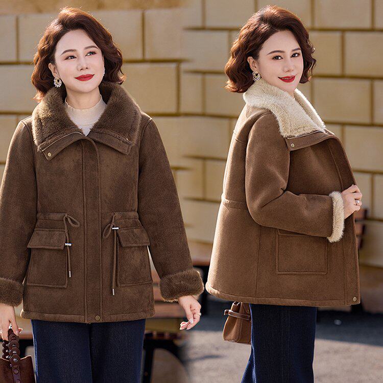 冬季新款女士翻领皮毛一体外套中老年妈妈冬装加绒麂皮绒保暖棉衣